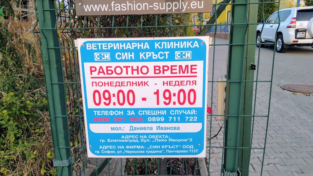 „Син Кръст“ – ветеринарна клиника се намира на бул. „Пейо К. Яворов“ 2 в Благоевград и е разпозната като обект в сферата на здравето и ветеринарната грижа. Клиниката се отличава с ангажимент към професионалното обслужване и внимателно отношение към животните. С общ рейтинг от 4.2 звезди на база 23 отзива, много клиенти оценяват екипа като отзивчив, загрижен и компетентен. Според споделените мнения, специалистите в клиниката се отнасят с внимание към пациентите и техните стопани, проявяват търпение и предоставят адекватна помощ. Ако търсите ветеринарна клиника с добра репутация в Благоевград, „Син Кръст“ може да бъде подходящ избор за вашия домашен любимец.