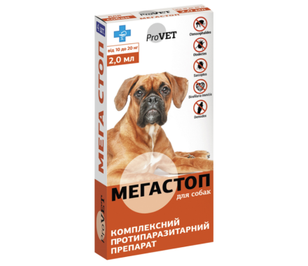 Краплі ProVET МЕГА СТОП є препаратом комплексної дії та ефективним для боротьби і профілактики екто- і ендопаразитів у собак. Препарат, випущений в формі крапель, найбільш зручний в застосуванні і не викликає стресу у тварини. У лабораторних умовах доведено ефективність препарату при ураженні собаки: