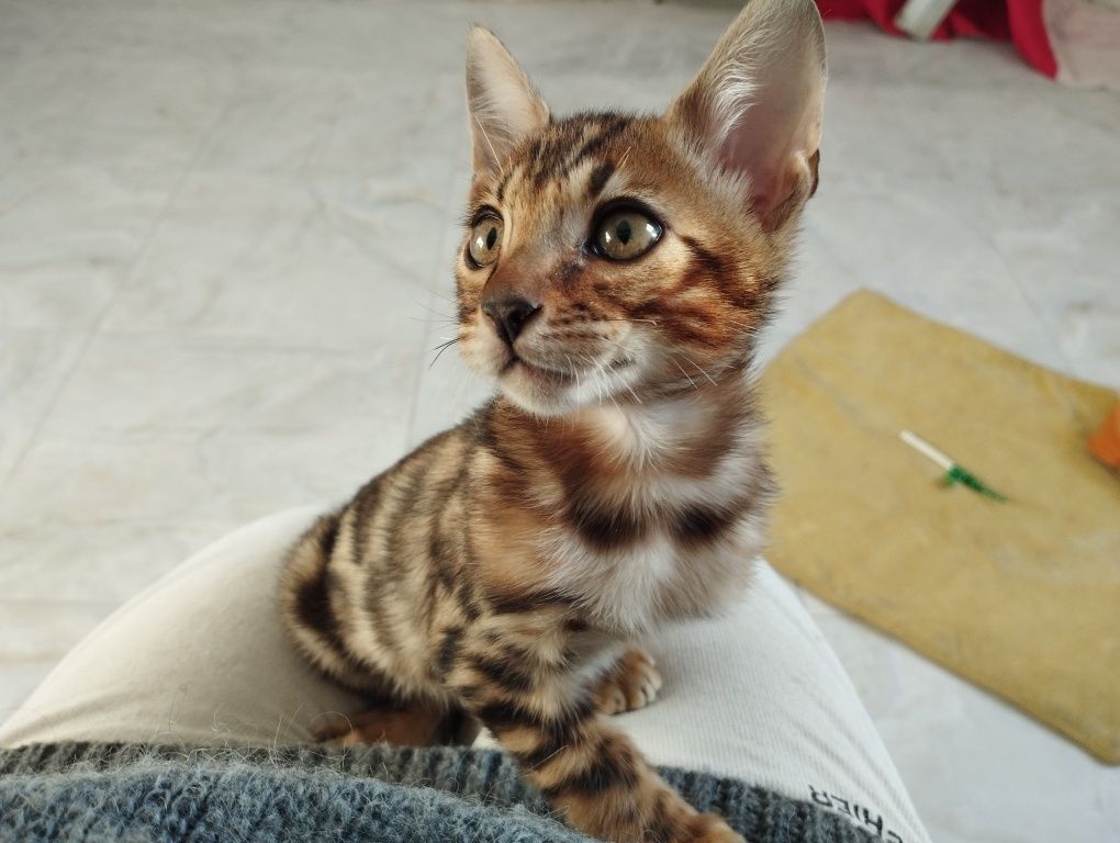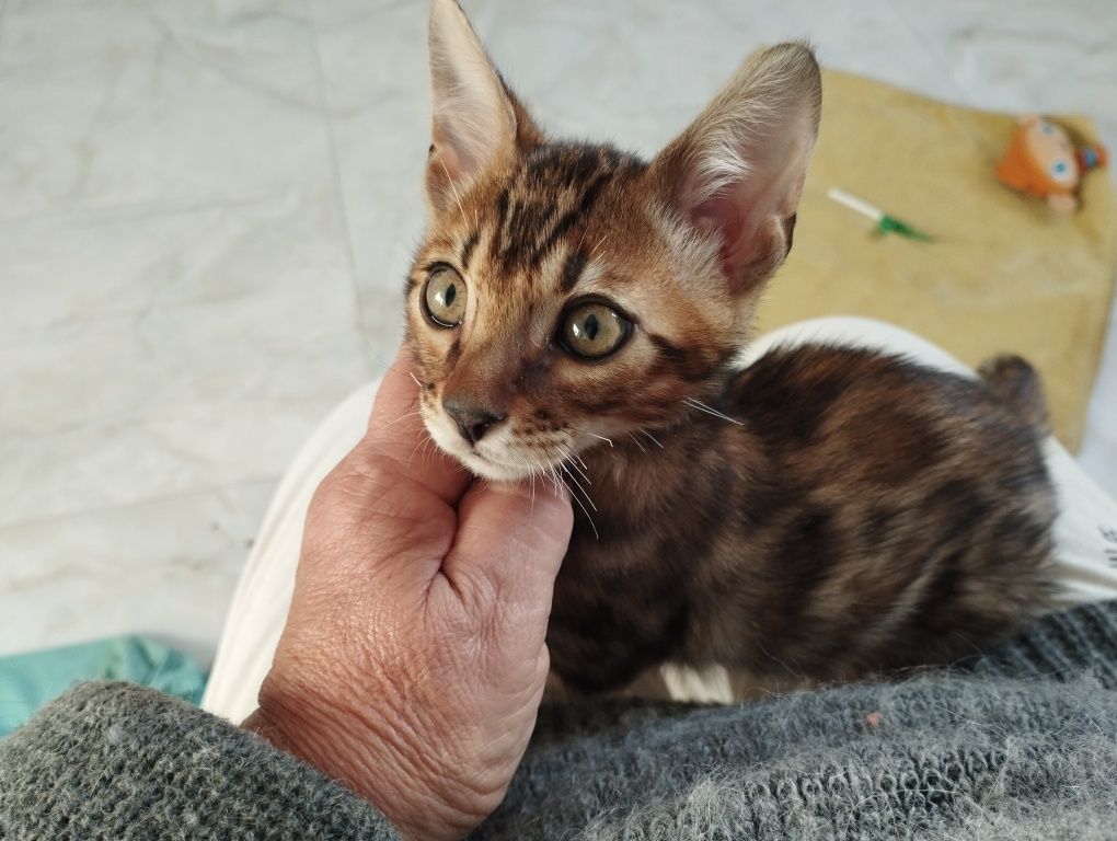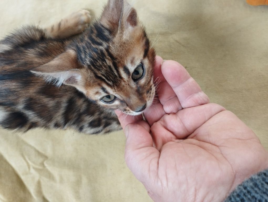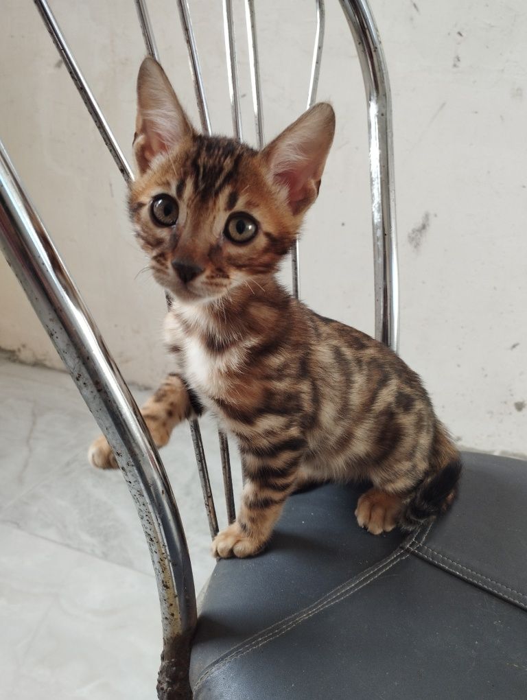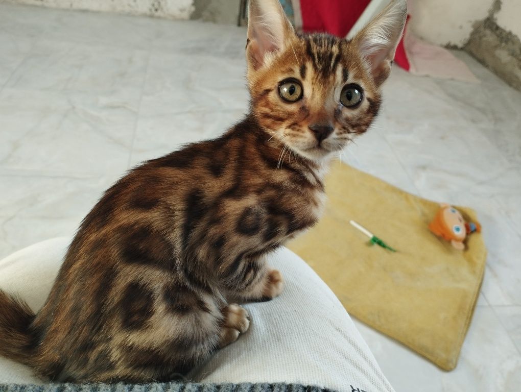 Порода: Бенгальська Стать: Хлопчик Забарвлення: Яскраве триколірне забарвлення, велика закрита розетка. Характер: Ласкавий, грайливий.