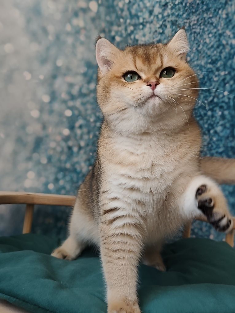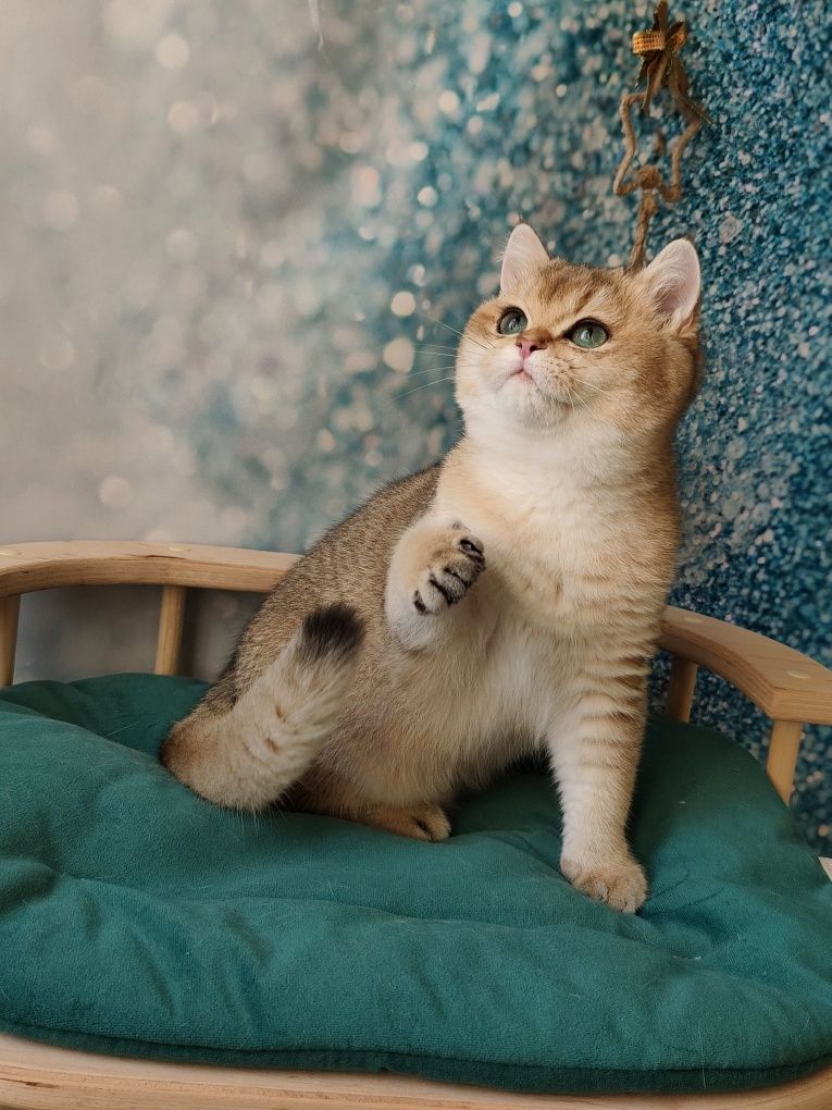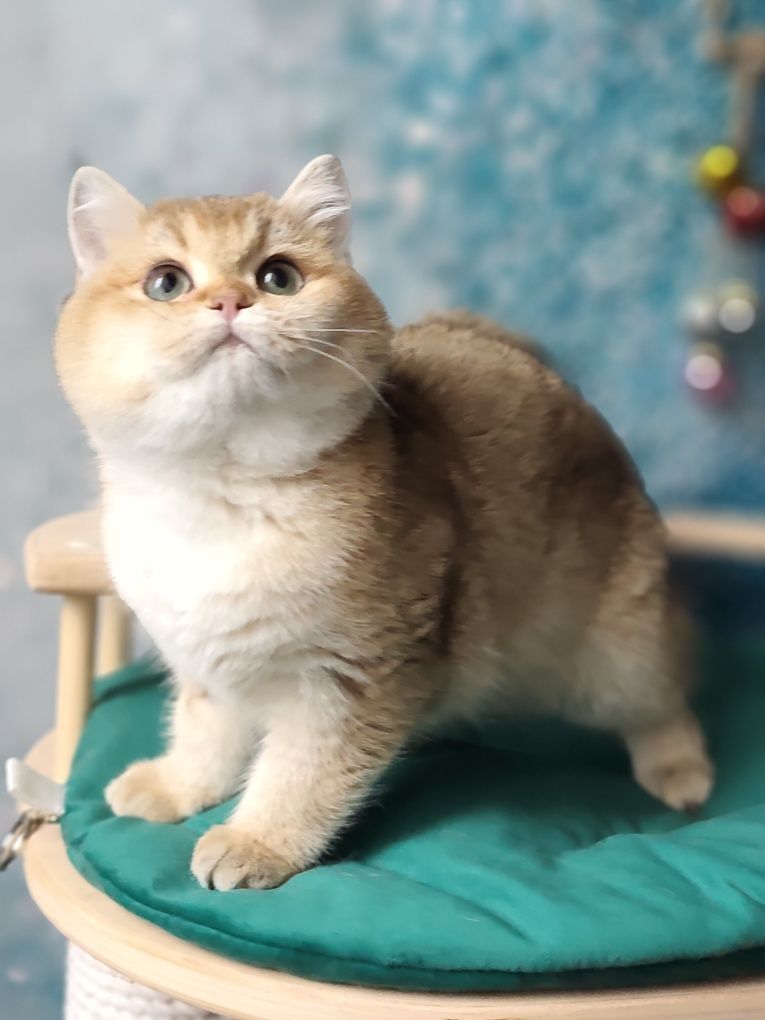 Золота британська шиншила, еліта в породі британців. Шовковиста золотава шерсть і кругла форма голови з великими зеленими або кольору морської хвилі очима. Компактне тіло і велюрова ніжна шерсть. Характер лагідний, це досягнення кількох поколінь лагідних адекватних батьків(агресивних не допускали до розпліднення)