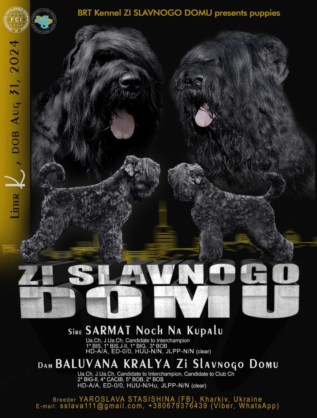 Пропонуються цуценята породи Чорний тер’єр, народжені 31 серпня 2024 року. Малюки походять від титулованих батьків і мають родовід КСУ-ФСІ. Власниця розплідника — ветеринар та кінолог із 30-річним досвідом, яка приділяє головну увагу здоров’ю та міцній психіці вихованців. Цуценята соціалізовані в міських умовах, мають врівноважену нервову систему та шоу-перспективи. Вони стануть надійними охоронцями та відданими компаньйонами.