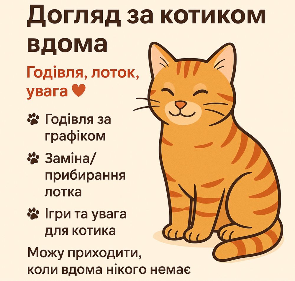 Відповідально, акуратно, люблю тварин і маю досвід догляду за котиками.