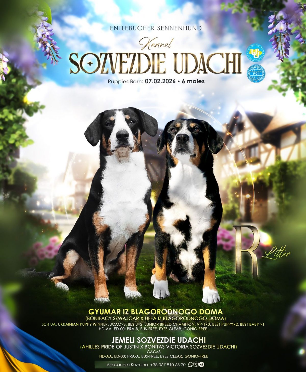 У нашому розпліднику, який працює з породою вже понад 16 років, народилися цуценята породи Ентлебухер зенненхунд. Малюки з’явилися на світ 7 лютого 2026 року. У приплоді маємо шість гарненьких хлопчиків, які ростуть міцними та активними. Батьки цуценят мають усі необхідні генетичні тести по здоров’ю, що гарантує якість та спадковість малюків.