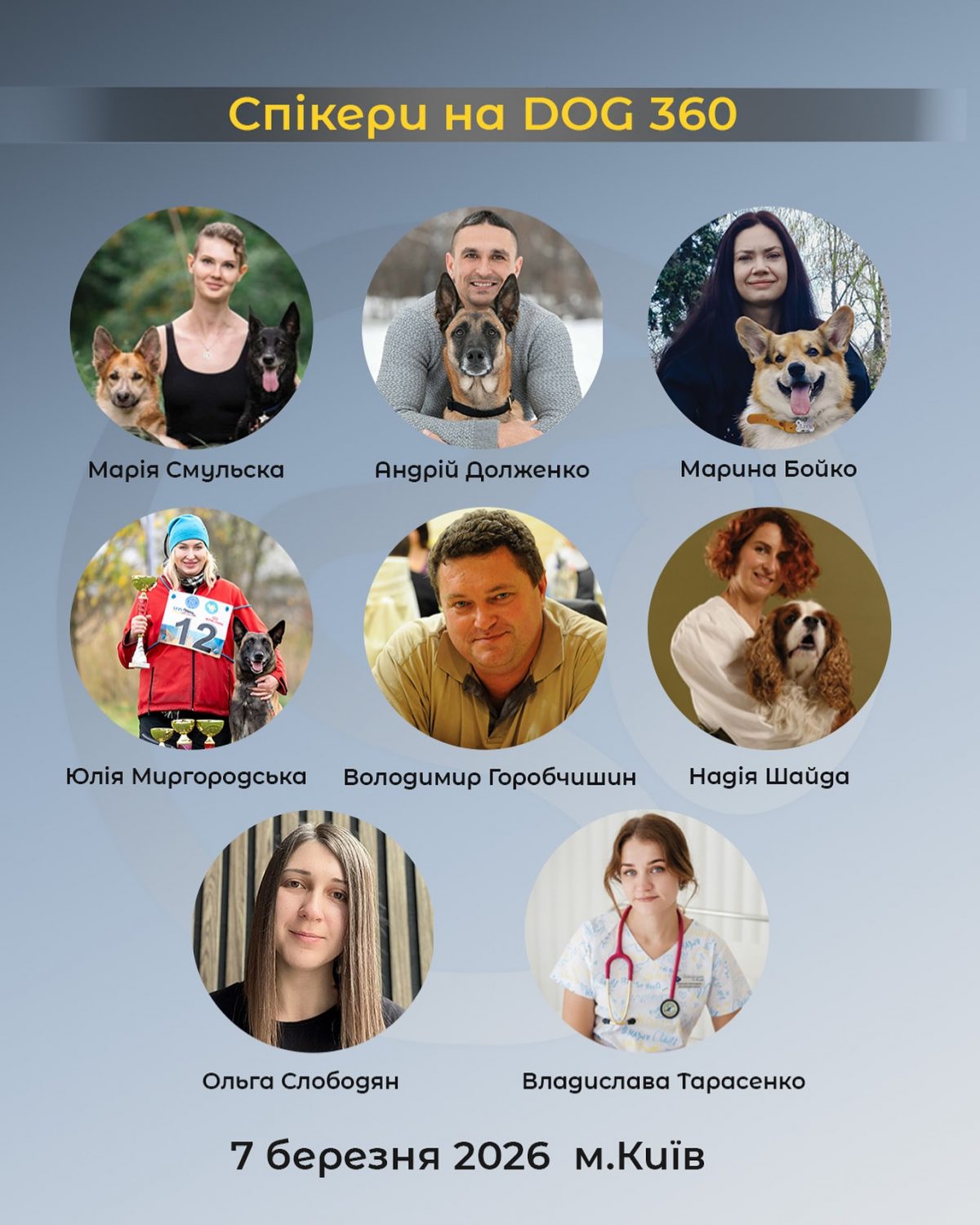 Спікери мають від 6 до 15 років практичного досвіду в кінології, спорті, суддівстві та пошуково-рятувальних роботах.