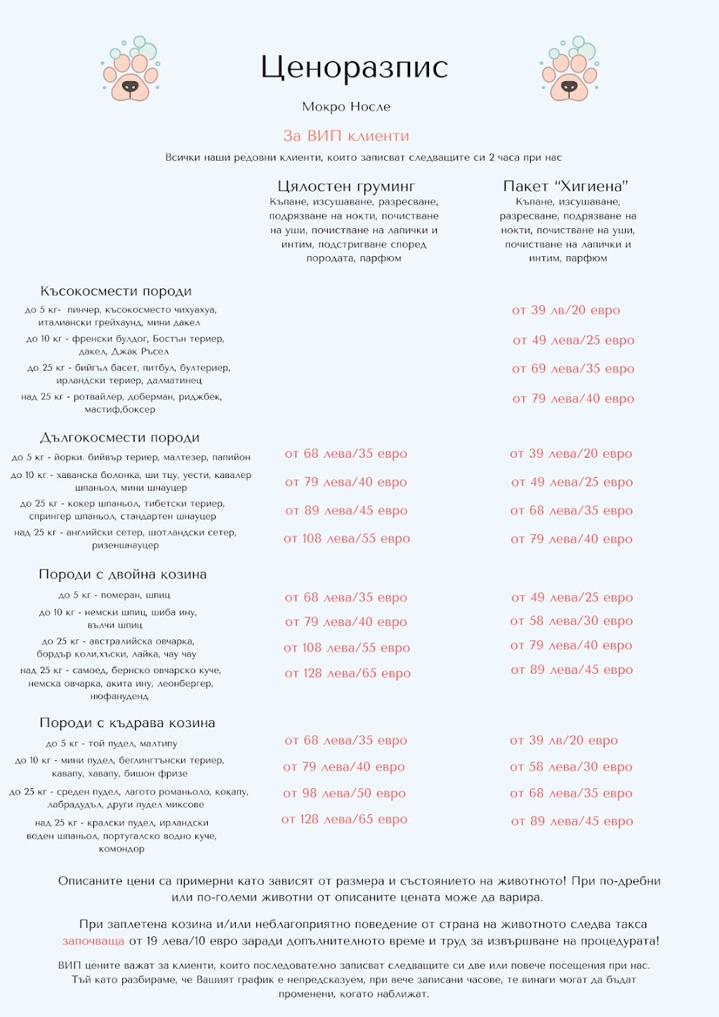 Мокро носле - груминг салон се намира на ул. „Пирин“ 85 в кв. Манастирски ливади, София. Този обект предлага основни услуги за подстригване и грижа за кучета. Клиентите споделят, че салонът се отличава с чиста и уютна обстановка, както и с деликатно отношение към животните. С рейтинг 5 от 7 ревюта, салонът е предпочитан избор за собствениците, които търсят професионализъм и внимание към детайла. Реалните отзиви подчертават старателната работа и добрия подход при всяко посещение. Ако търсите груминг услуги в Манастирски ливади, Мокро носле е сред местата, които заслужават внимание.
