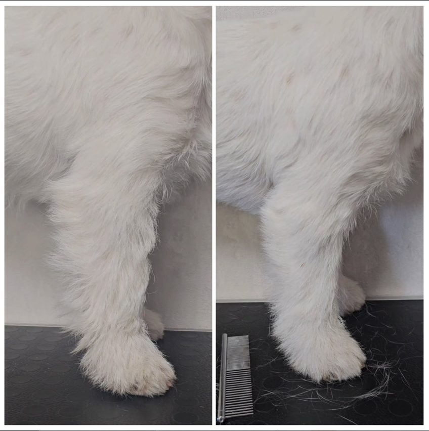Це професійне видалення відмерлої шерсті для жорсткошерстних собак (тримінг).