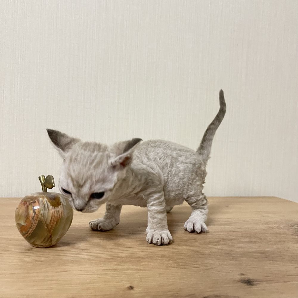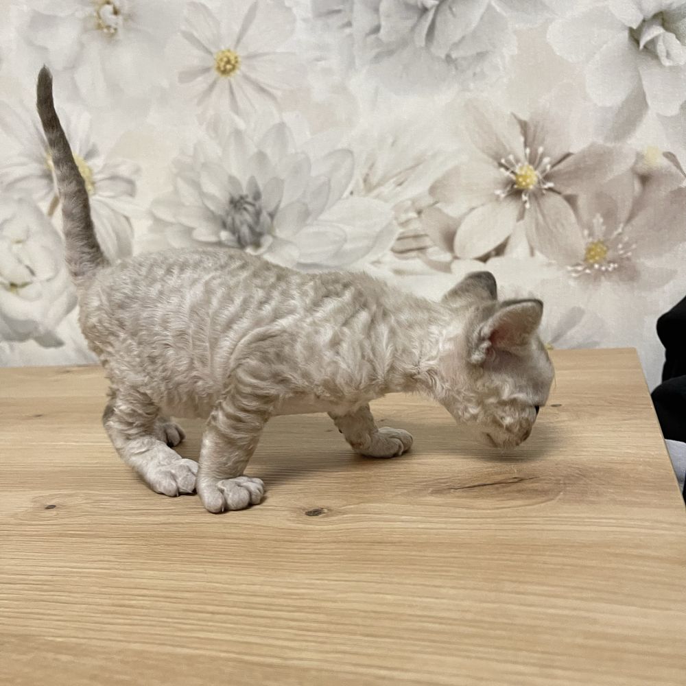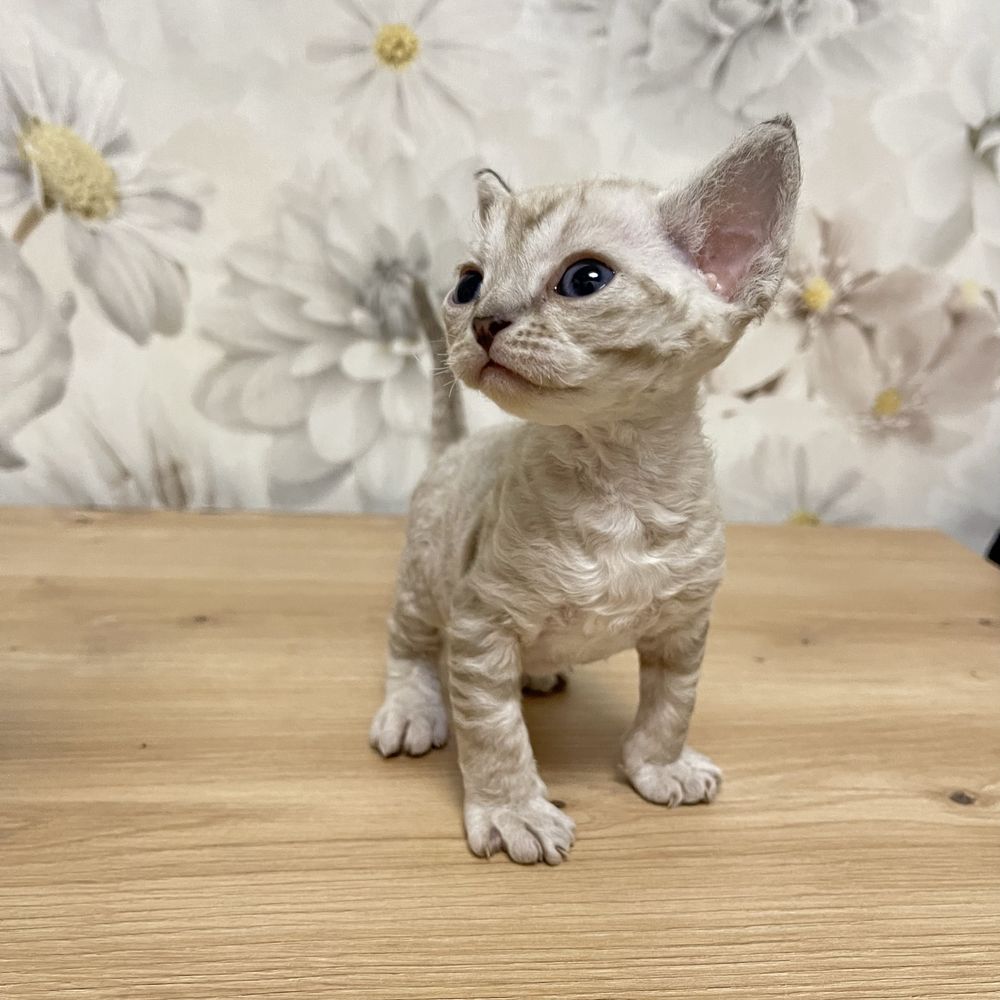 Народився 15.01.2026 зі всіма породними даними, гарно покритий хвилястою шубкою, колір має таббі, голубі великі очі, вушка з кісточками білки. Має лагідний, спокійний характер. Мама з татом чистокровні Девончики, фото 7- мама, фото 8 - тато.