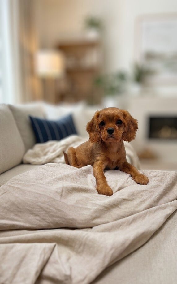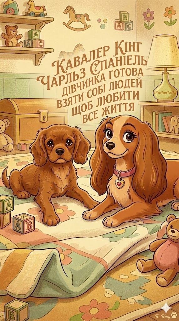 Пропонується чарівна дівчинка породи Кавалер-кінг-чарльз-спанієль рідкісного рубінового забарвлення. Малюк від виставкових батьків, професійно та відповідально вирощена, без жодного браку чи недоліків.
