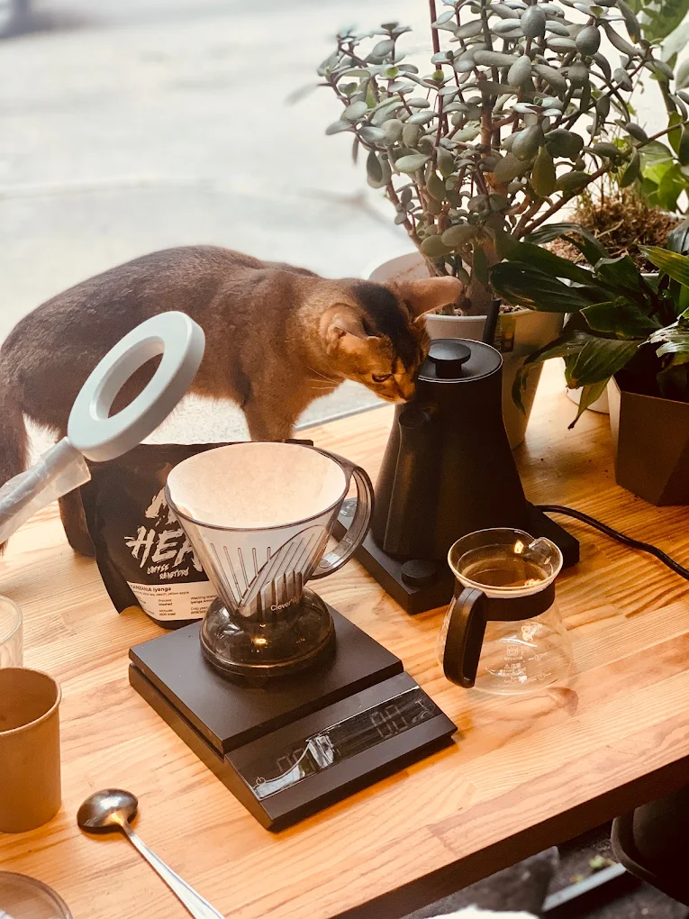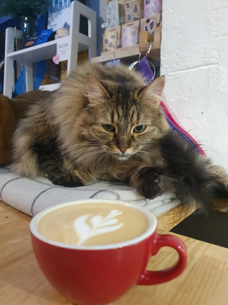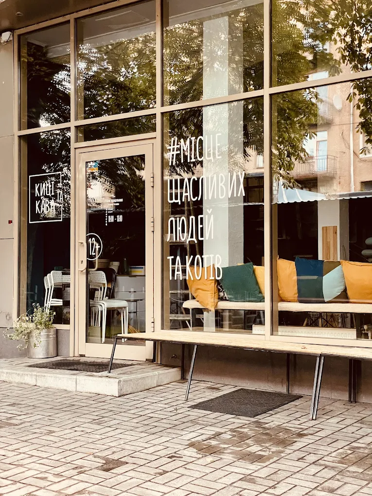 Кафе «Киці та кава» відоме завдяки приємній атмосфері та котам. Всередині їх досить багато. Є сфінкси, перси та звичайні котики. Усі спокійні, доглянуті. Біля входу гостей зустрічає адміністратор, який пояснює правильно поведінки. Гладити - можна, фотографувати без спалаху - теж, головне - користуватися антисептиком і не ображати тварин.