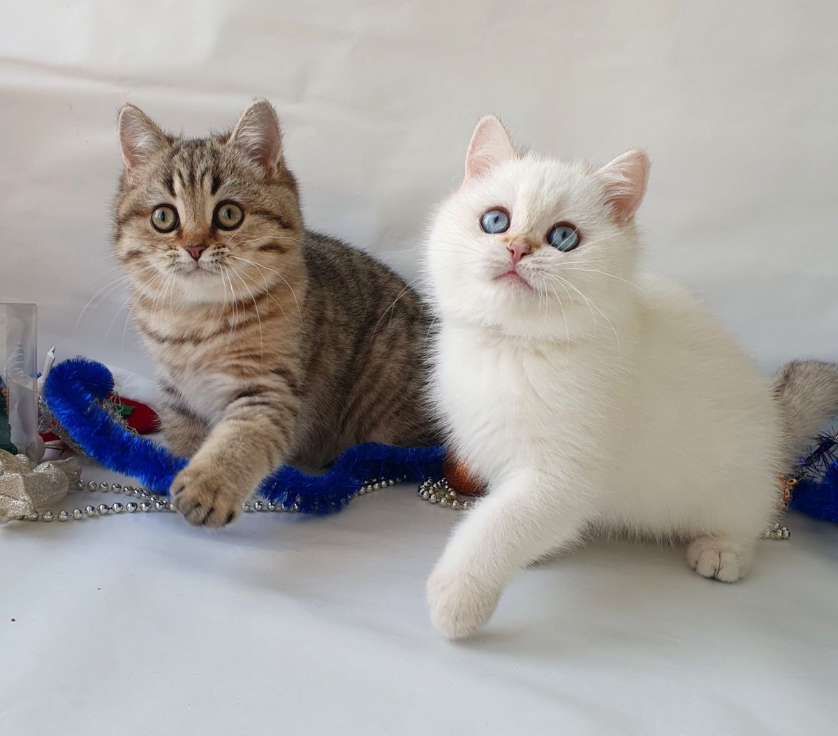 Чарівні британчики-котики з плюшевою, розкішною шубкою, у одного котика забарвлення колорпоінт (біле), другий котик темного забарвлення (чорний в цяточку) . Білий котик з виразними блакитними очима. Темний котик має очі бурштинового кольору (помаранчевого). Обидва котики схожі на ведмежатка — маленьке сонячне диво, створене, щоб дарувати любов і затишок у домі. Котик у домі буде антидепресантом для дорослих і найкращим другом для дитини