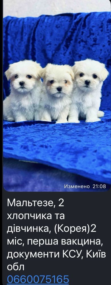 Порода: Мальтезе Стать: Хлопчики та дівчинка Вік: 2 місяці Здоров’я: Щеплення за віком