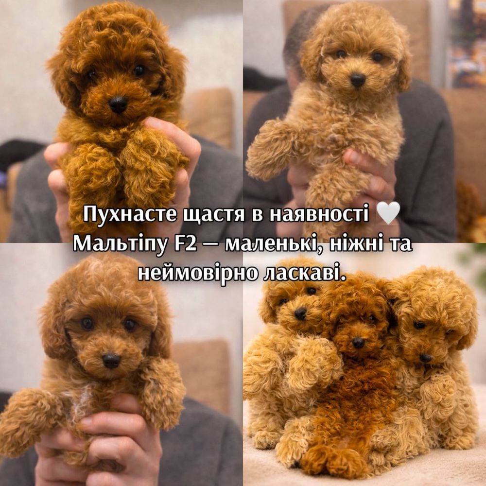 Пропонуються цуценята дизайнерської породи Мальтіпу F2 та Той-пудель. Малюки мають густу кучеряву шерсть, яка не линяє та не викликає алергії. Цуценята розумні, соціалізовані та мають міцне здоров’я. Батько малюків китайської крові.