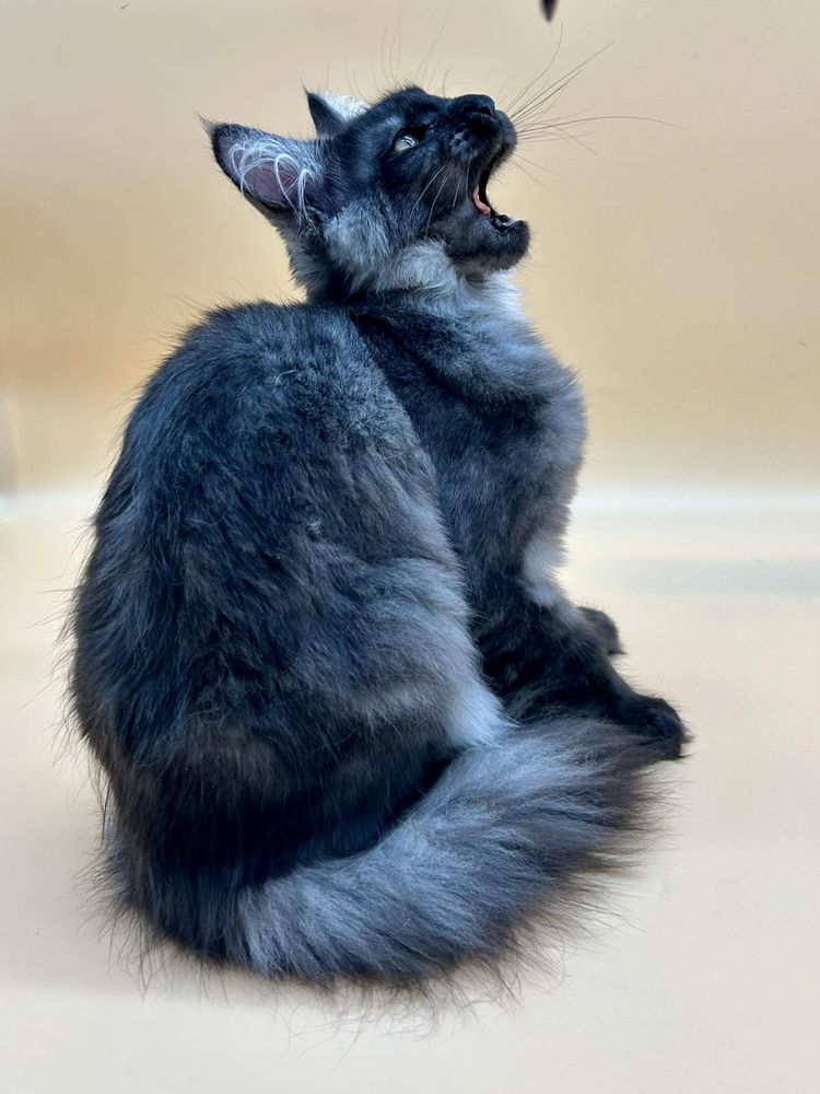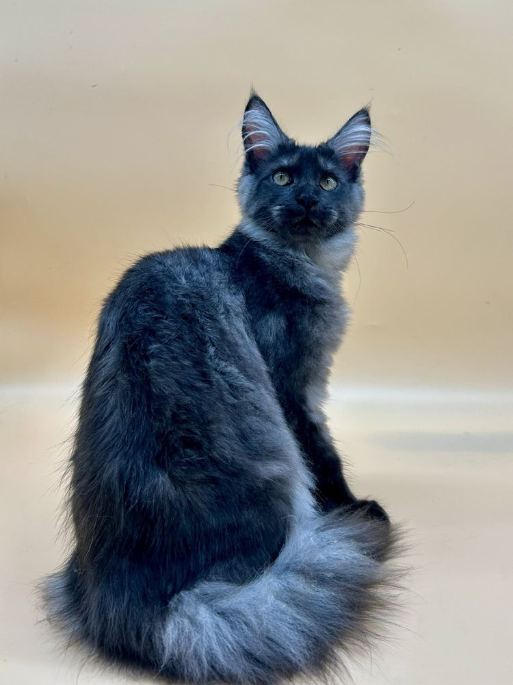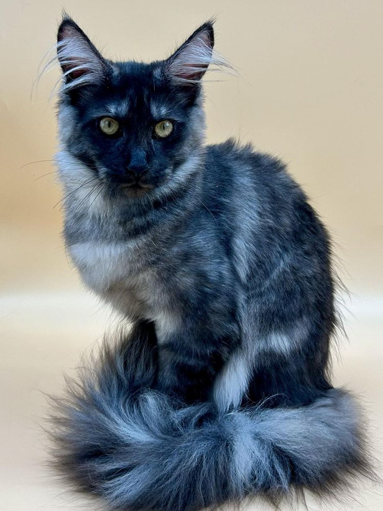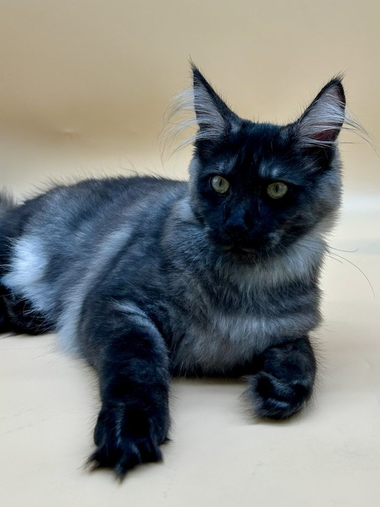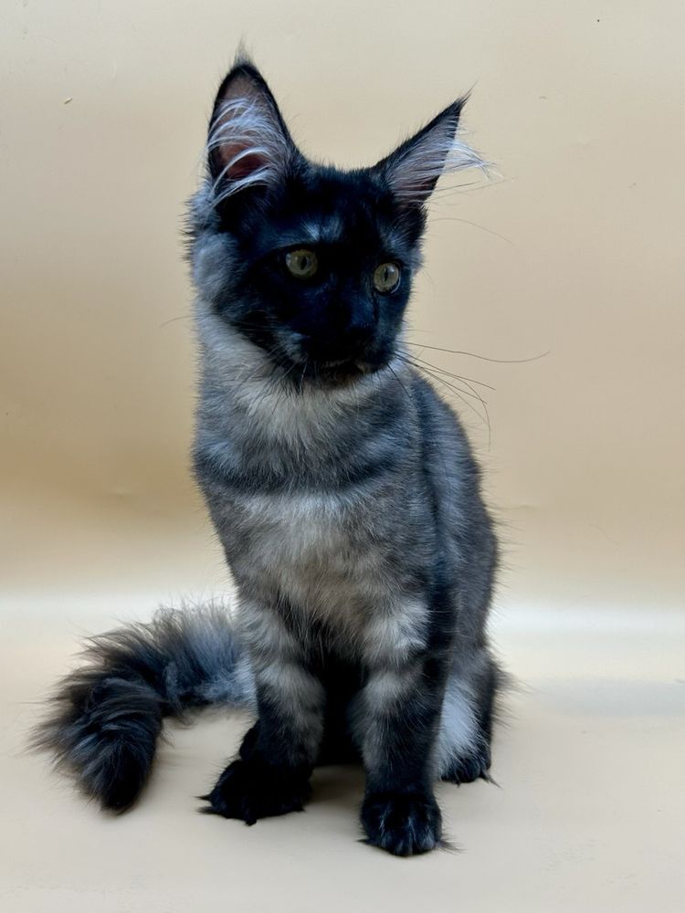Мейн кун дівчинка, чорний дим. Привчена до лотка і кігтеточки, родовід, вет паспорт. Ніжна малятко, характер підлесливий. Доставка по Україні та всьому світу