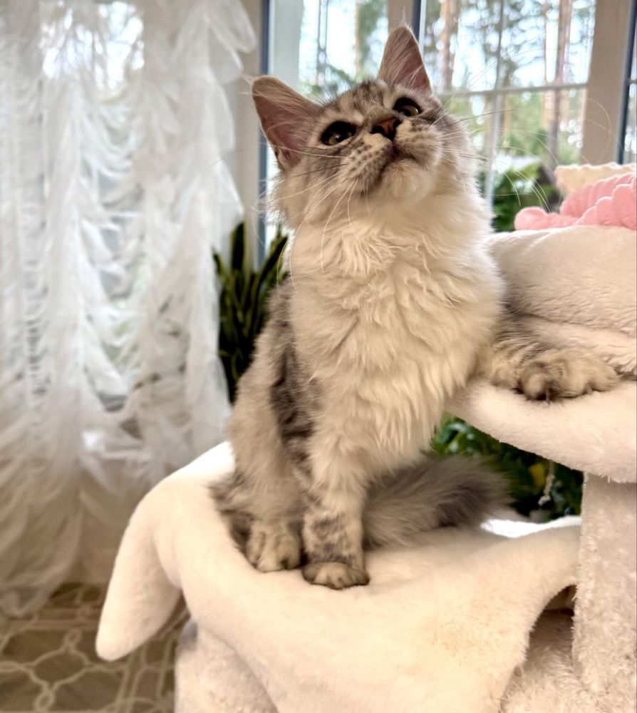 Мейн-кун рідкісного забарвлення — сріблястий із легким сніжним відтінком, переплетений із чорним мармуровим димом. Такий малюнок — справжній дар природи, який робить кошеня особливим з першого погляду.