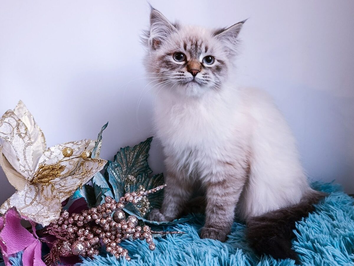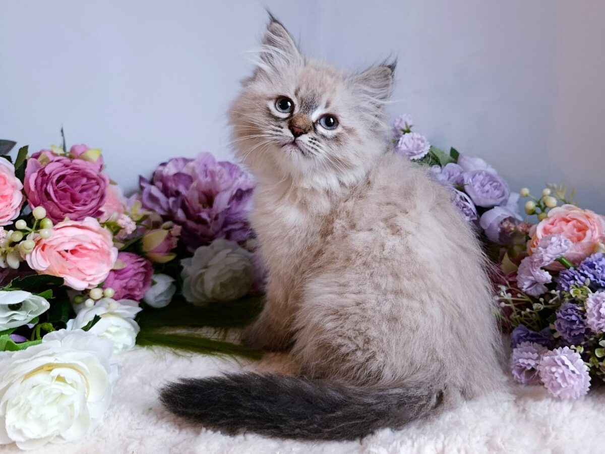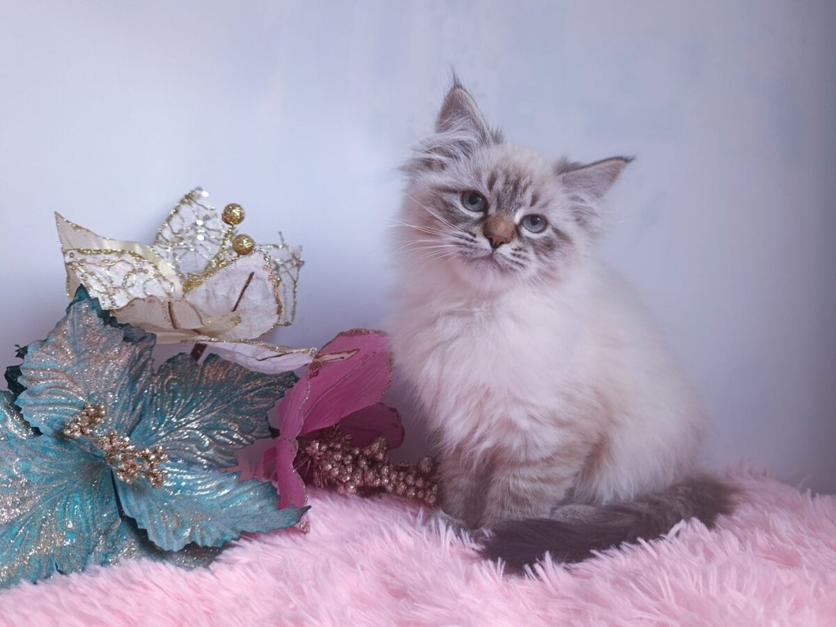 Дівчинка Blanche - дуже мила, комунікабельна і людиноорієнтована. Має невеличку родову травму вушка, майже непомітну, алуту зв’язку з цим нюансом ціна знижена (стандартна ціна наших кошенят від 1000$ і вище).