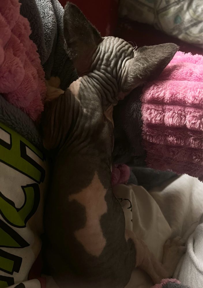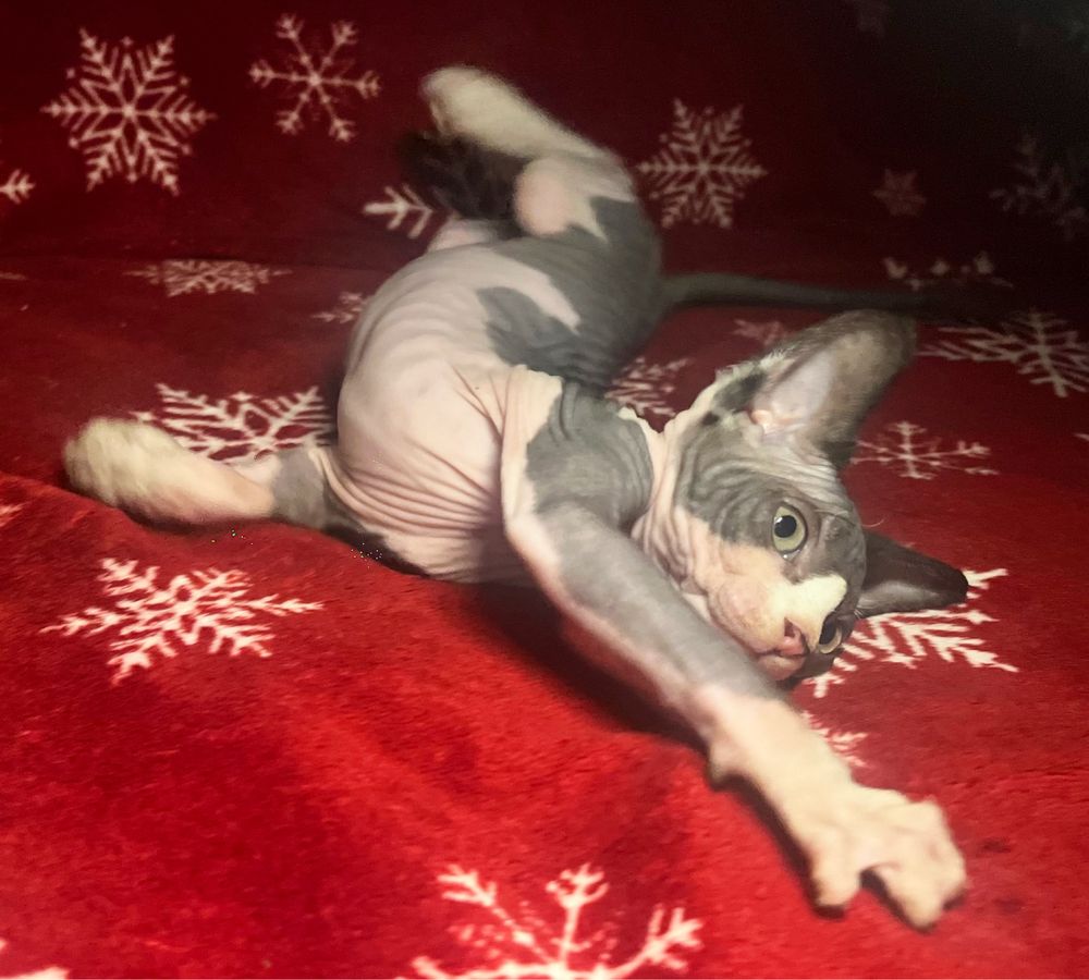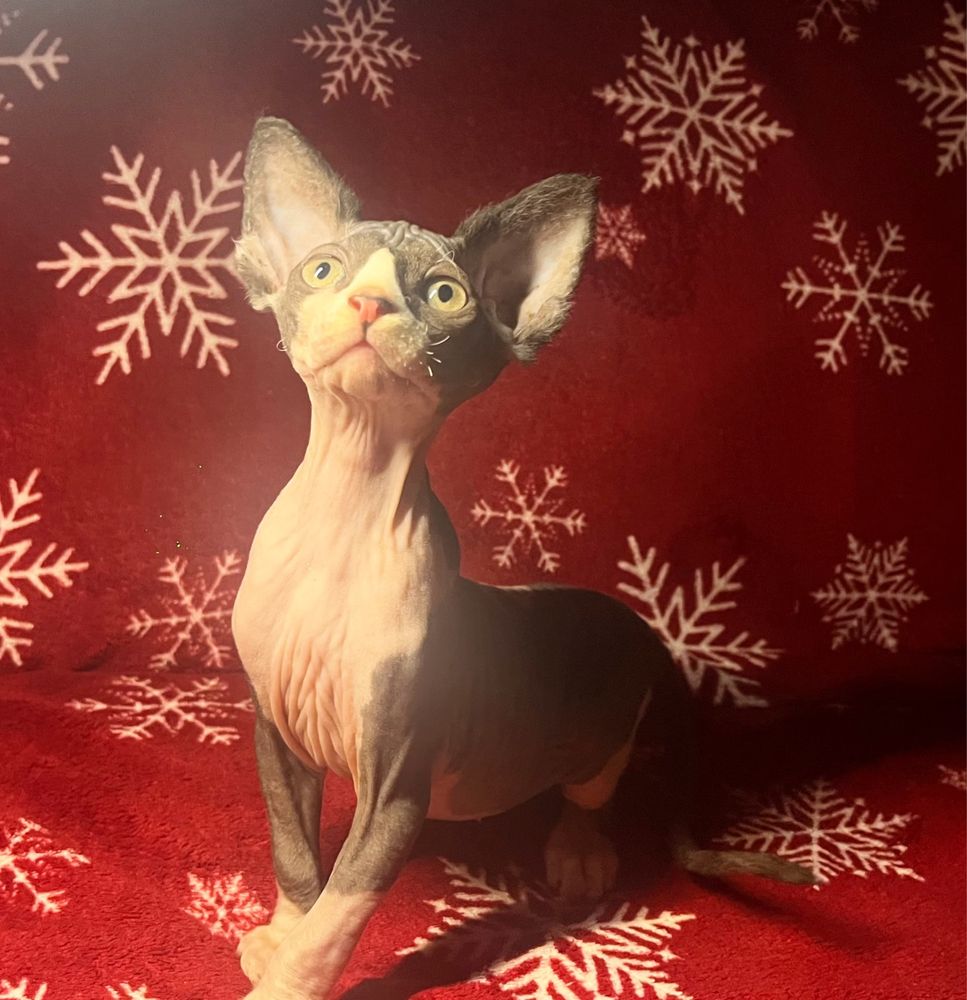 Неймовірно мила дівчинка породи канадський сфінкс, рідкісного біколорного забарвлення. Вік — 7 тижнів. Має оксамитову, теплу шкіру, великі вушка та виразні оченята. Дуже активна, грайлива й лагідна. З дитинства звикла до людей та інших тварин, добре користується лоточком.
