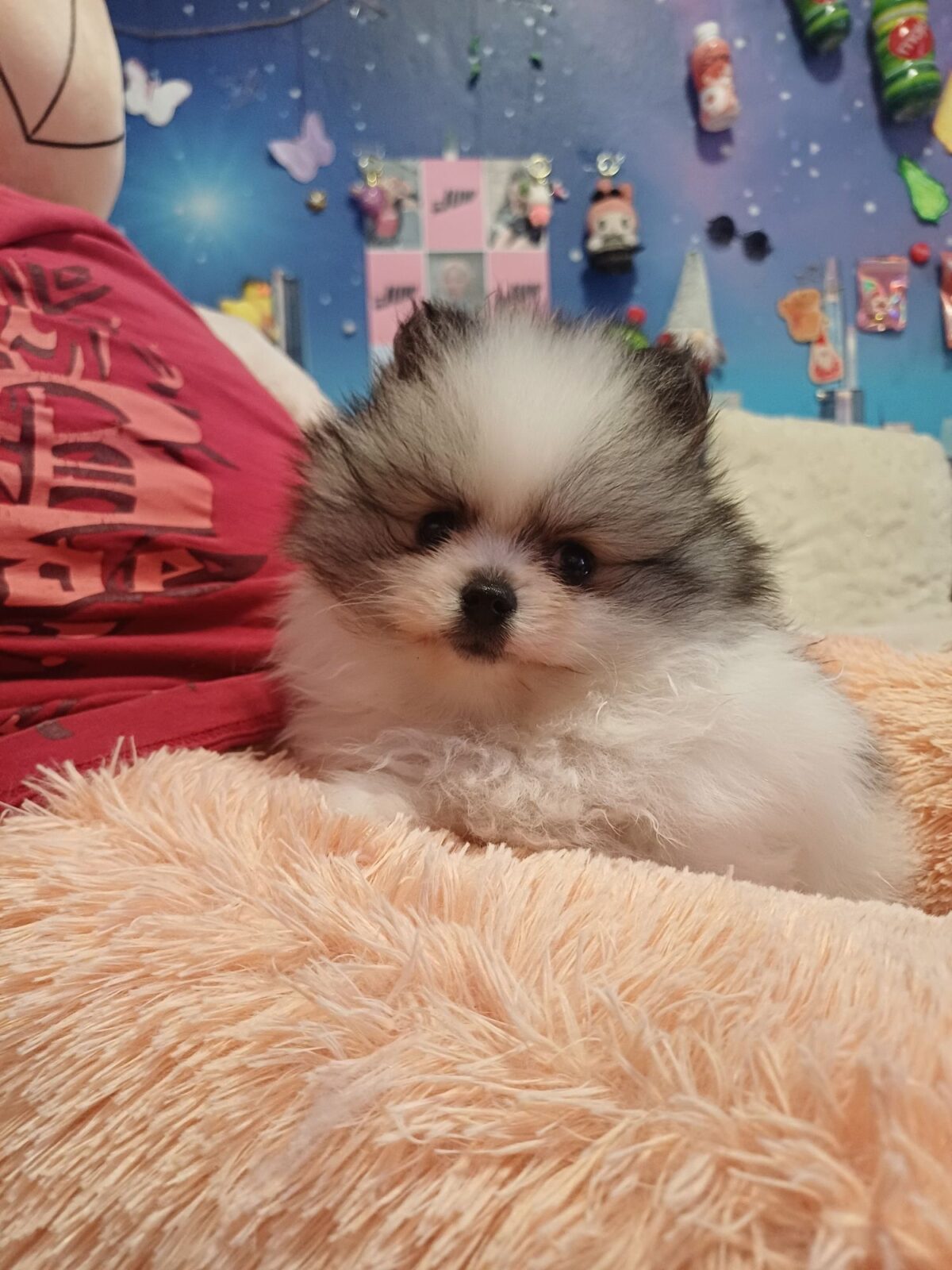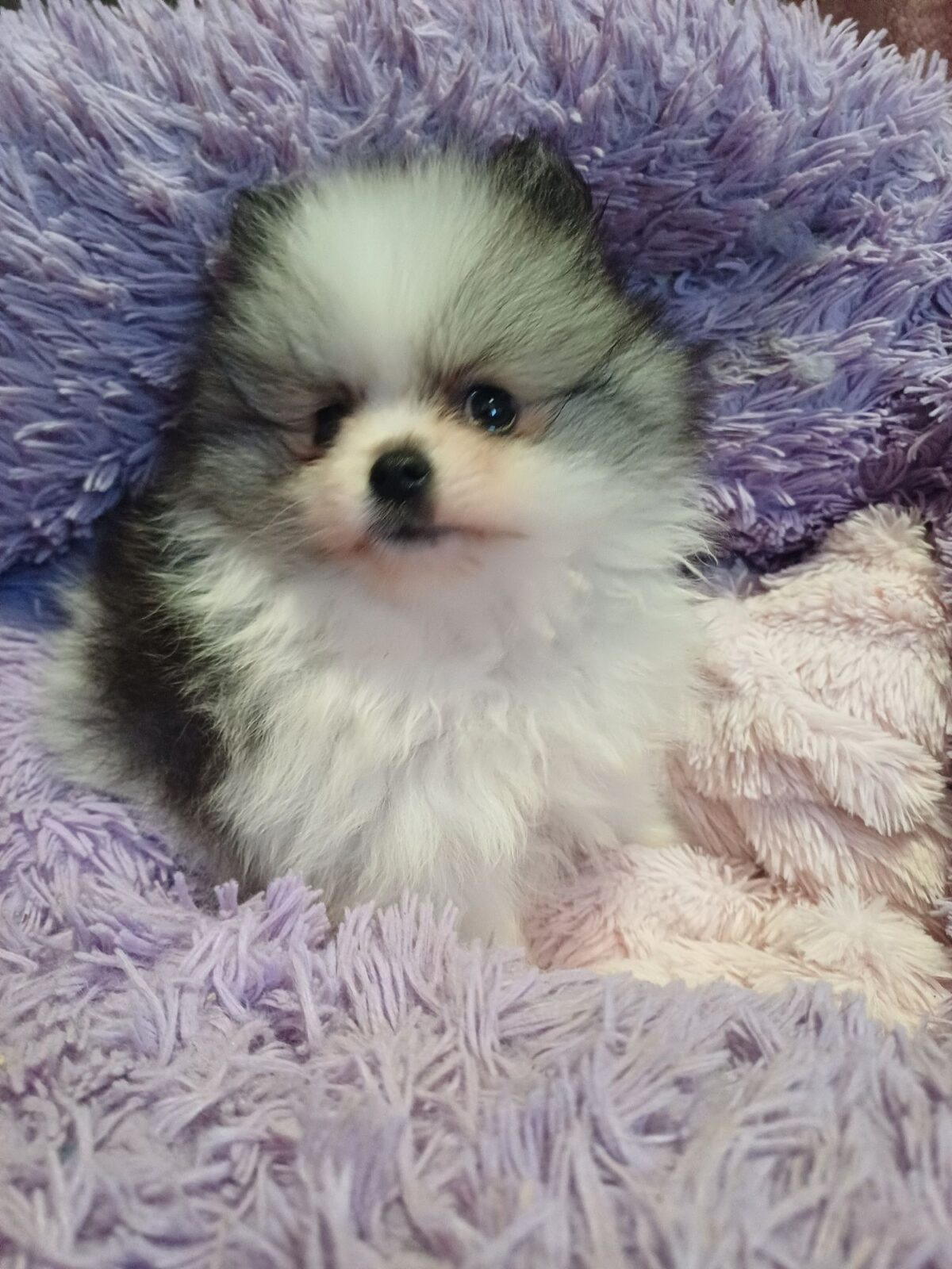 Пропонується до продажу чарівна дівчинка породи Шпіц у рідкісному забарвленні паті-колор. Малюк має дуже густу та набивну шерсть, що робить її схожою на маленьке ведмежа.