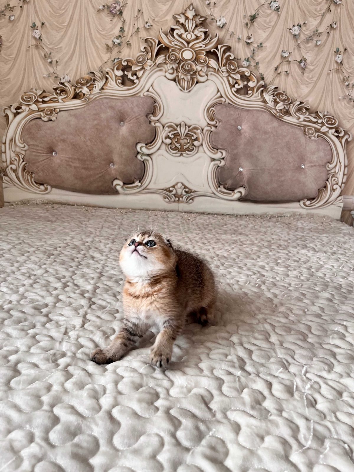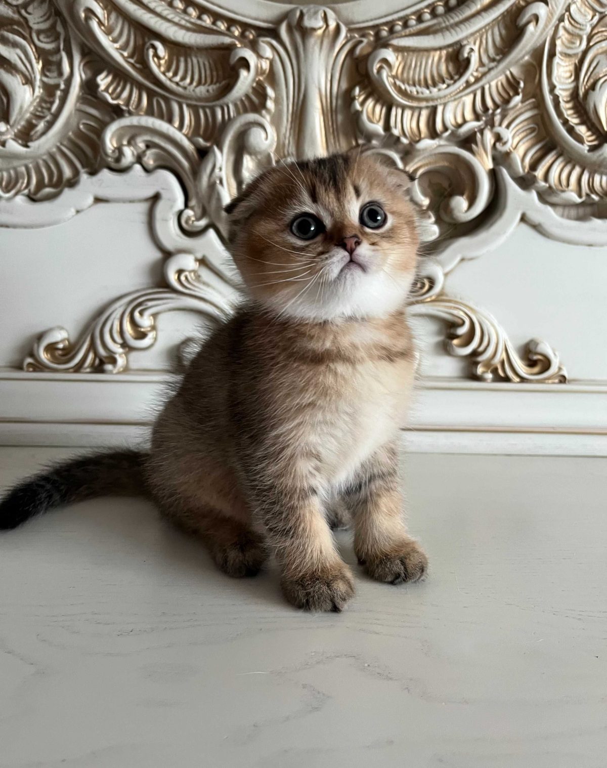 Чудовий, крупний, мастистий котусик-яскравий представник Шотландської породи! Дуже крупний з широкими лапками, чудової масті хлопчик- шотландський висловухий котусик в дорогоцінному та ексклюзивному окрасі золота шиншила. Малюк має ідеальний характер, справжній добрячок!