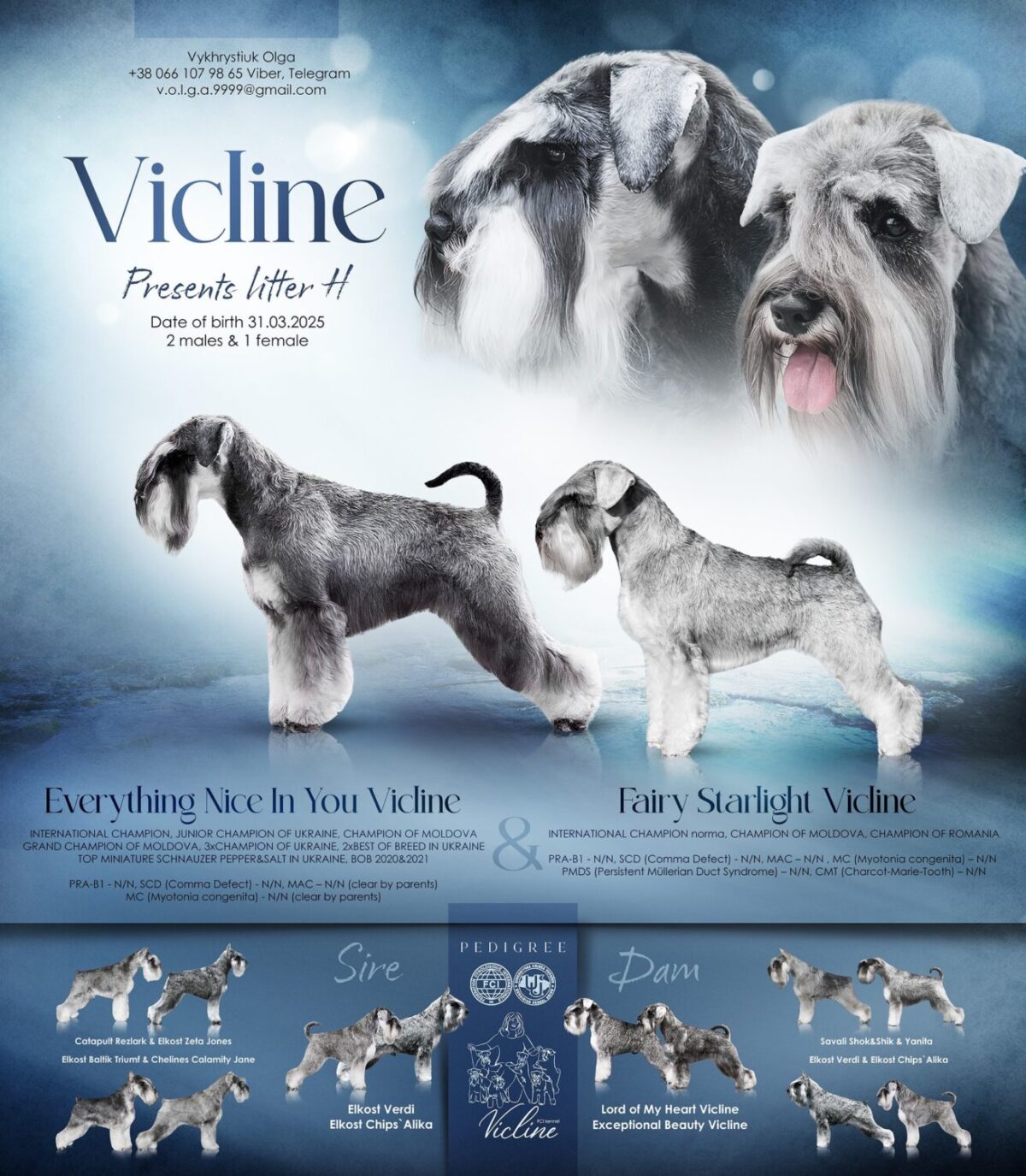 Розплідник Цвергшнауцерів «Vicline» — це офіційний центр розведення породи у місті Харків. Власниця розплідника Ольга має колосальний досвід роботи з собаками. Вона займається професійним розведенням вже близько 15 років. Наш розплідник спеціалізується на Цвергшнауцерах класичного окрасу перець із сіллю. Ми ставимо за мету збереження кращих якостей цієї інтелектуальної породи. Кожна собака у нашому розпліднику є частиною великої родини. Ми гарантуємо чистопородність та високу якість кожного вихованця. Ви обираєте надійного друга з перевіреним родоводом та генетикою.