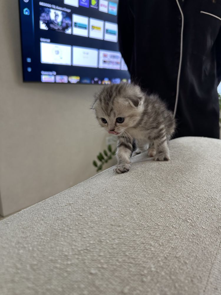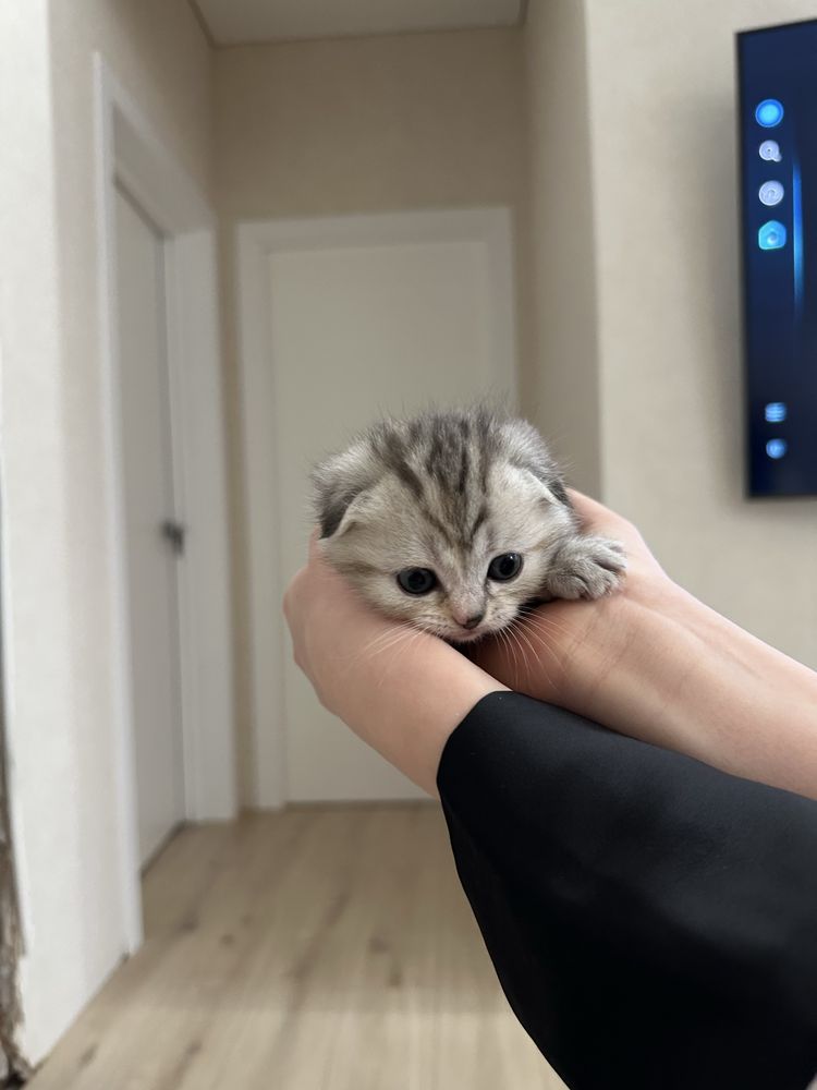 Чарівна шотландська висловуха дівчинка з красивим сріблясто-золотим мармуровим забарвленням.