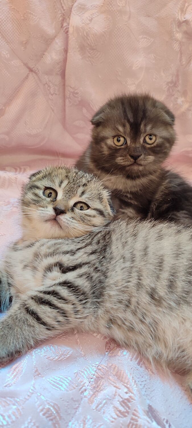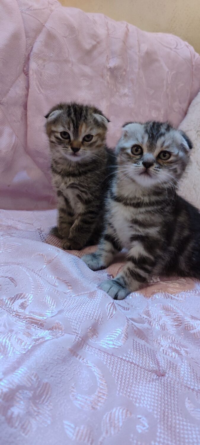 Маленькі кошенята повністю готові до переїзду у свої люблячі родини! 2 хлопчики, 2 дівчатка. Порода скоттіш фолд. Забарвлення дівчаток — таббі споттед черепаховий та мармуровий таббі (Віскас). Забарвлення хлопчиків — таббі споттед та мармуровий чорний дим. Малюки соціалізовані, люблять ласку та увагу, грайливі та допитливі. Їдять сухий та вологий корм Роял Канін, привчені до лотка, оброблені, вивчають когтеточку. Батьки наші. Більше фото та відео у Вайбері та Телеграмі. Перекупників прохання не турбувати!!! Посилками, кур’єрами, поїздами не відправляємо!!! Забирати тільки з дому. Знаходимося в районі аеропорту.