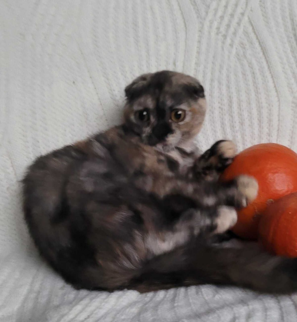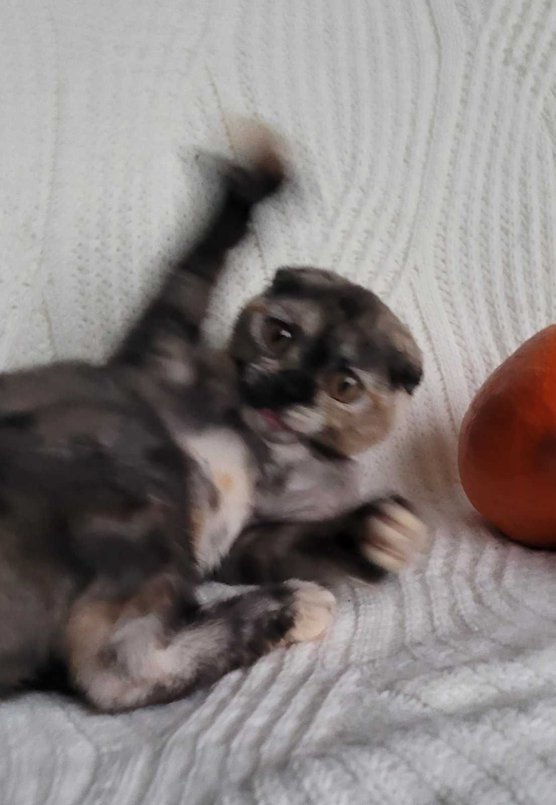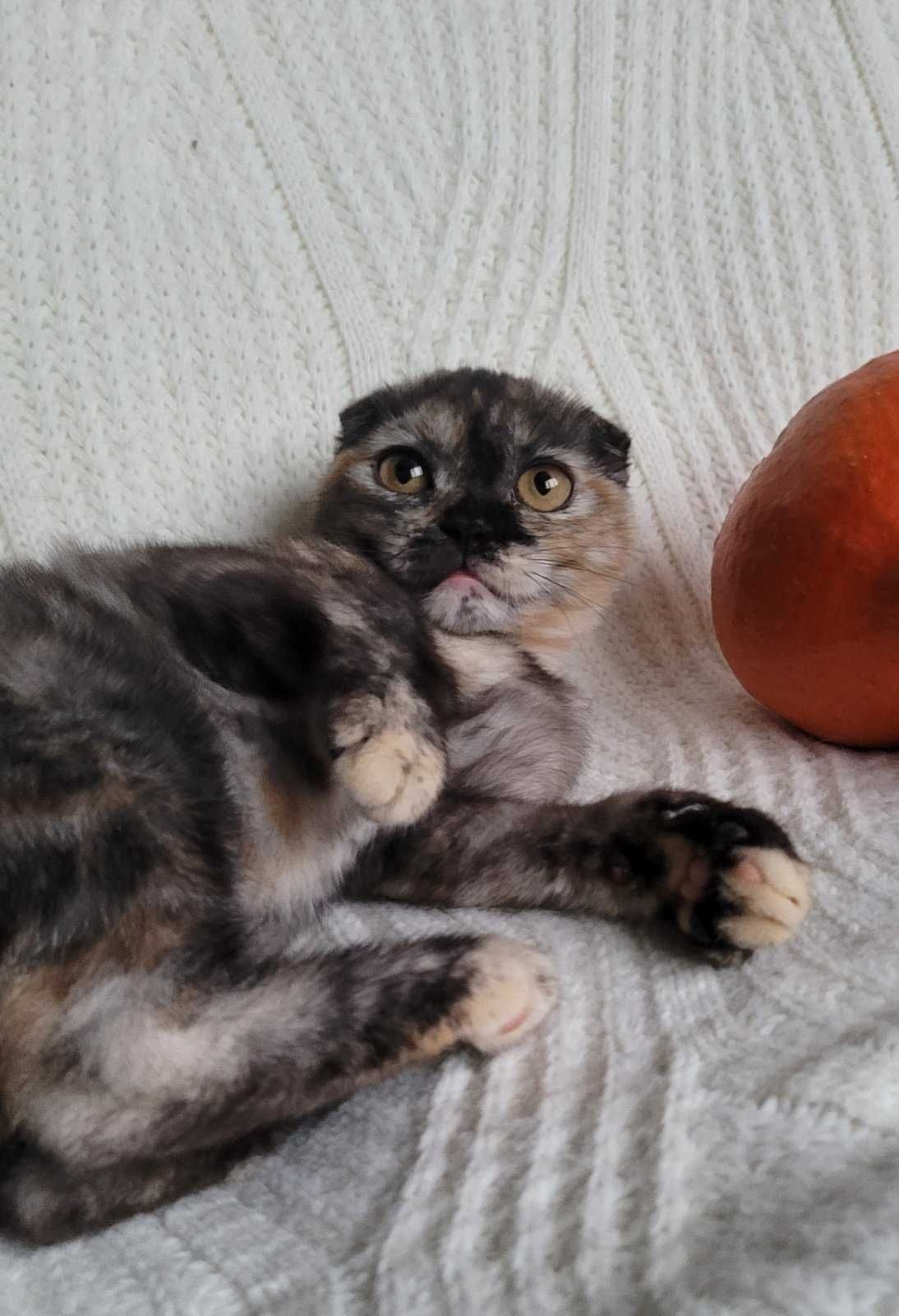 Скотіш фолд дівчинка з маленькими вушками, круглими великими очима та манюсеньким носиком- наче лемунчик чи мавпочка-ігрунка. Подвійна вакцинація, може планувати переїзд