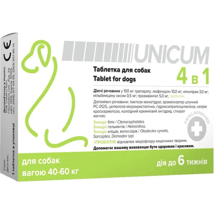 Unicum 4 в 1 таблетка протипаразитарна для собак. Протипаразитарний засіб у вигляді таблеток зі смаком яловичини застосовується для профілактики і лікування собак від ектопаразитів (членистоногих: бліх, волосоїдів, вошей, кліщів) та ендопаразитів (нематод, цестод).