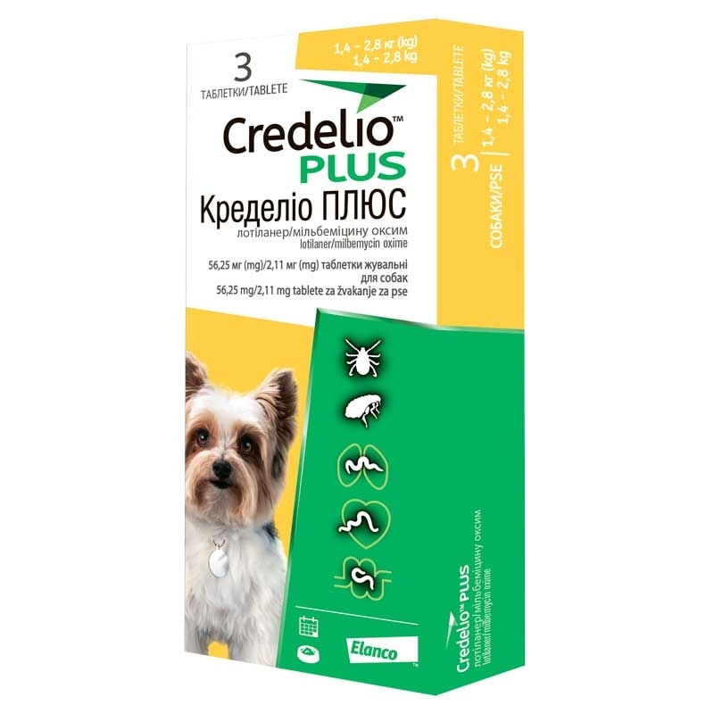 Протипаразитарні жувальні таблетки Credelio Plus від Elanco — це високоефективний засіб для комплексного захисту найменших собак вагою від 1,4 до 2,8 кг. Препарат забезпечує надійний захист від бліх та кліщів, а також діє проти внутрішніх паразитів: шлунково-кишкових гельмінтів та личинок серцевих черв’яків. Завдяки мініатюрному розміру та приємному смаку м’яса, таблетка легко сприймається маленьким вихованцем.