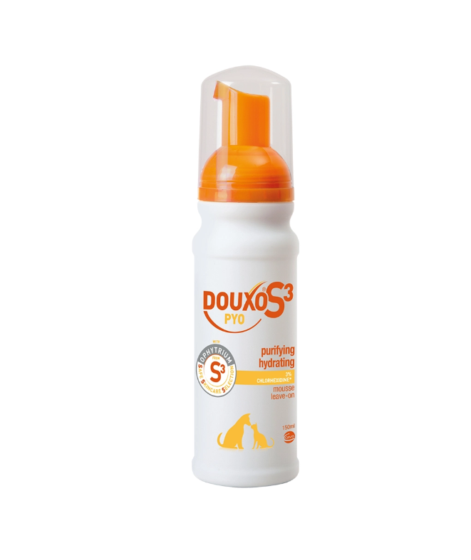 Мус Дуксо S3 Пуо (Douxo S3 Pуo) – мус для очищення шкіри, має дезінфікуючі й антисептичні властивості завдяки вмісту 3% хлоргексидину диглюконату, зволожує та підтримує екосистему шкіри. Антибактеріальна та протигрибкова ефективність проявляється вже протягом 10 хвилин після нанесення. Реструктурує та допомагає розплутати шерсть, залишаючи її м’якою та блискучою. ДУКСО S3 ПУО МУС має м’яку очищаючу формулу та гіпоалергенний аромат.