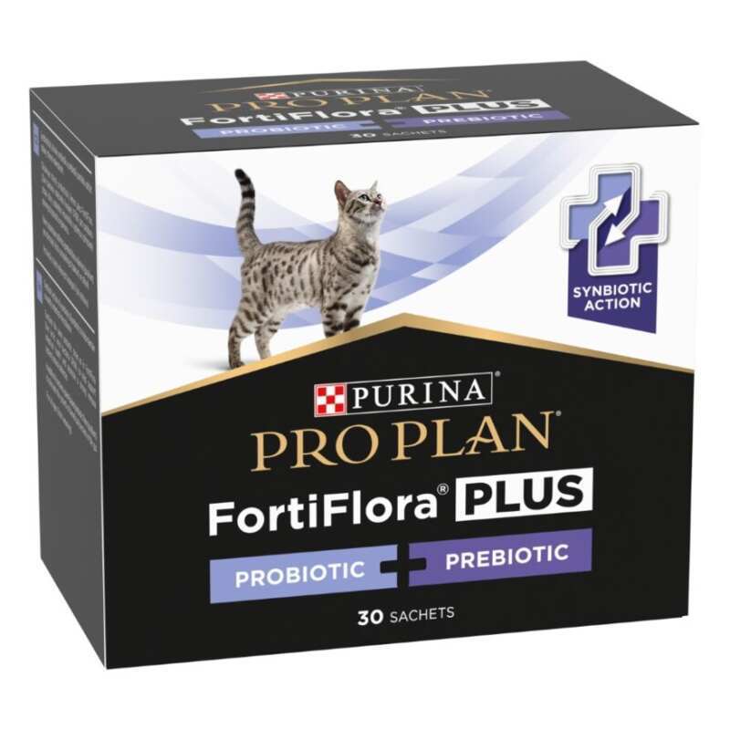 Кормова добавка FortiFlora Plus від відомого бренду Pro Plan допоможе нормалізувати мікрофлору кишківника як у дорослого кота, так і у кошеня (після переведення на самостійне годування). Завдяки симбіозу пребіотика та пробіотика створюються оптимальні умови для розмноження корисних бактерій. Це допомагає не лише покращити мікрофлору кишківника, а й зміцнити організм вихованця. Додатковий корм дають вихованцю з їжею, він лише покращує смак корму, оскільки містить у складі поживні та смачні м’ясні компоненти.