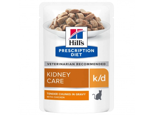 Hill’s Prescription Diet k/d Вологий корм для котів, з куркою – повнораціонний дієтичний корм, що підтримує належне функціонування нирок у разі гострої та хронічної хвороби нирок у дорослих котів. Корм вирізняється низьким вмістом фосфору та обмеженим вмістом високоякісного білка, що допомагає у лікуванні хронічної хвороби нирок та уповільнює прогресування захворювання.