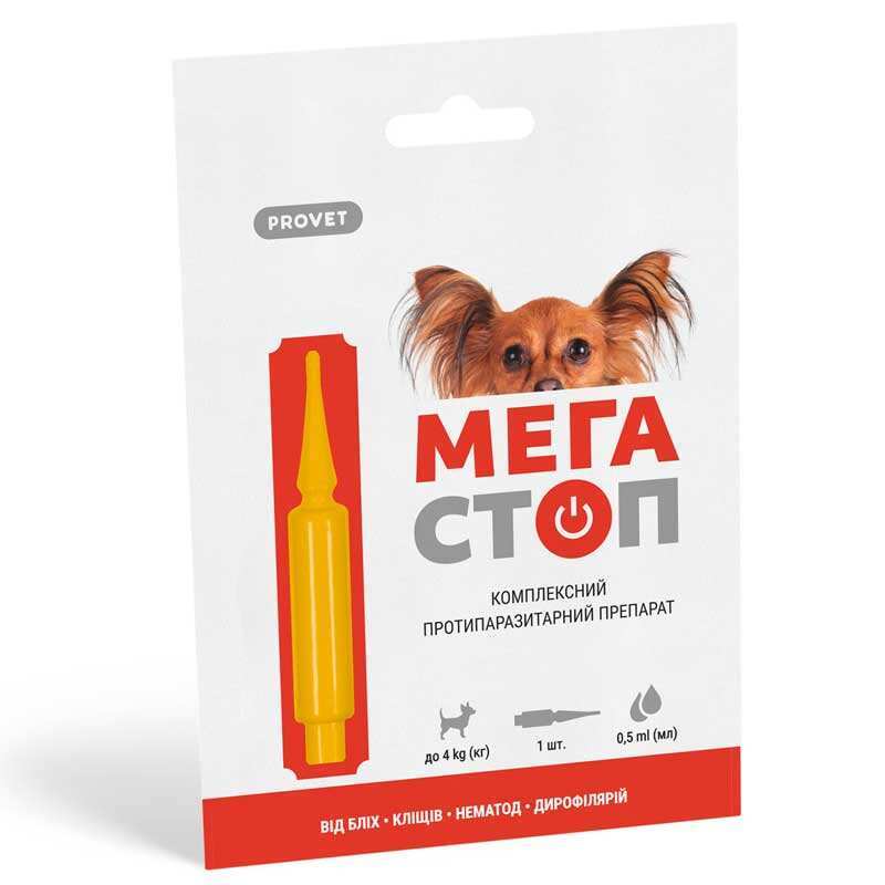 Краплі ProVET МЕГА СТОП є препаратом комплексної дії та ефективним для боротьби і профілактики екто- і ендопаразитів у собак. Препарат, випущений в формі крапель, найбільш зручний в застосуванні і не викликає стресу у тварини. У лабораторних умовах доведено ефективність препарату при ураженні собаки: