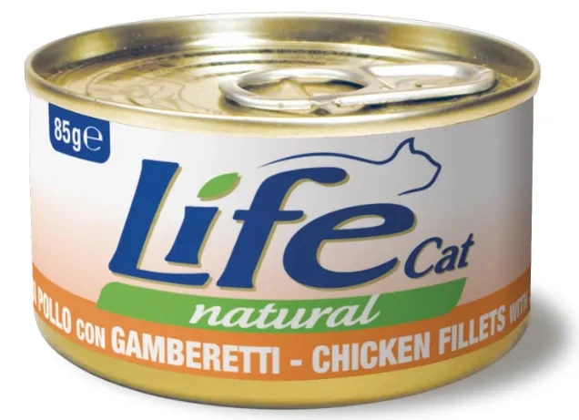 Натуральний вологий корм з курячим філе та креветками для дорослих котів Lifecat Natural містить цілісні шматочки філе та креветки, збагачений необхідними вітамінами та мінералами для збалансованого раціону вихованця.