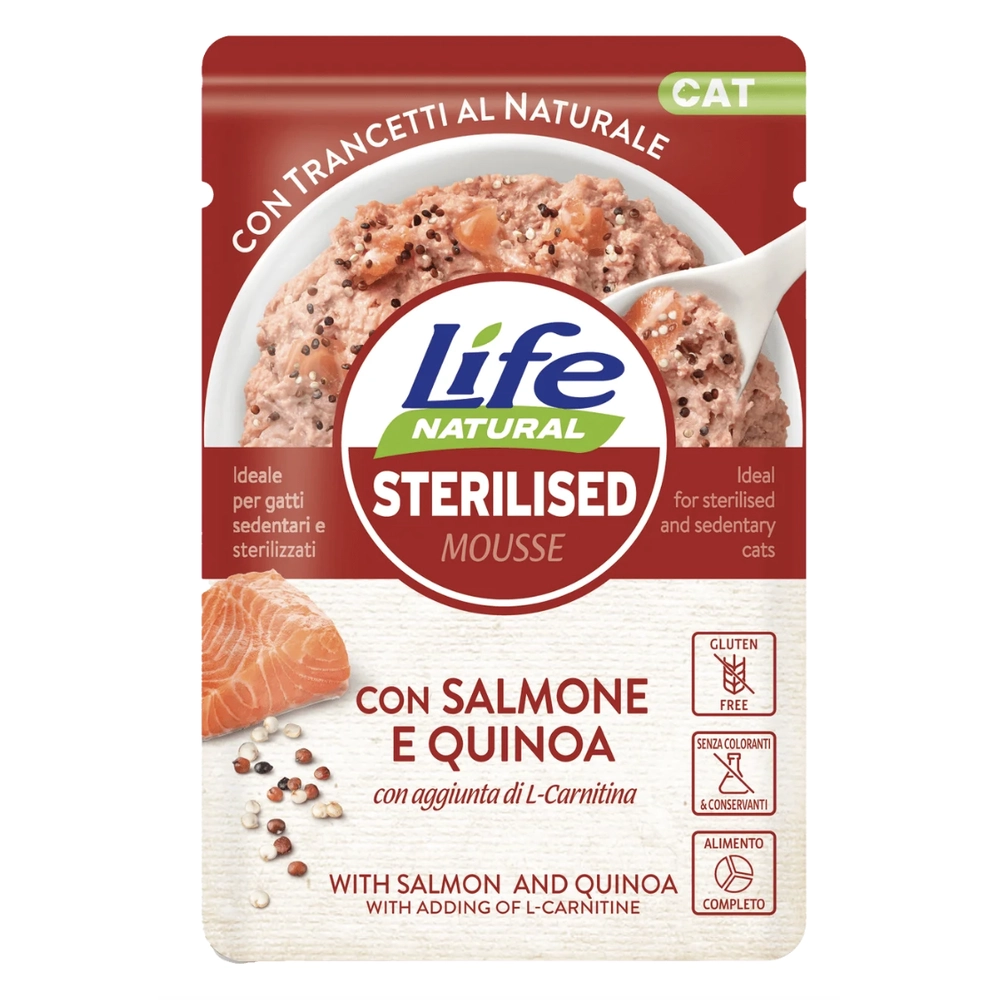 Натуральний повнораційний вологий корм холістик класу виготовлений із мусу, утвореного з цілісних шматочків тунця та лосося зі справжніми шматочками натуральної риби на поверхні для дорослих стерилізованих кішок. Відмінної якості справа, приготована на пару без додавання штучних консервантів, підсилювачів смаку, ароматизаторів, барвників та цукру з додаванням мінералів та вітамінів. Стерилізовані кішки мають тенденцію до набору ваги. Цей корм допомагає впоратися з цим завдяки наявності L-карнітину та кіноа. L-карнітин – це речовина, яка сприяє перетворенню жирової маси на енергію та контроль ваги. Кіноа - крупа з низьким глікемічним індексом, легка і багата на корисні мікроелементи.