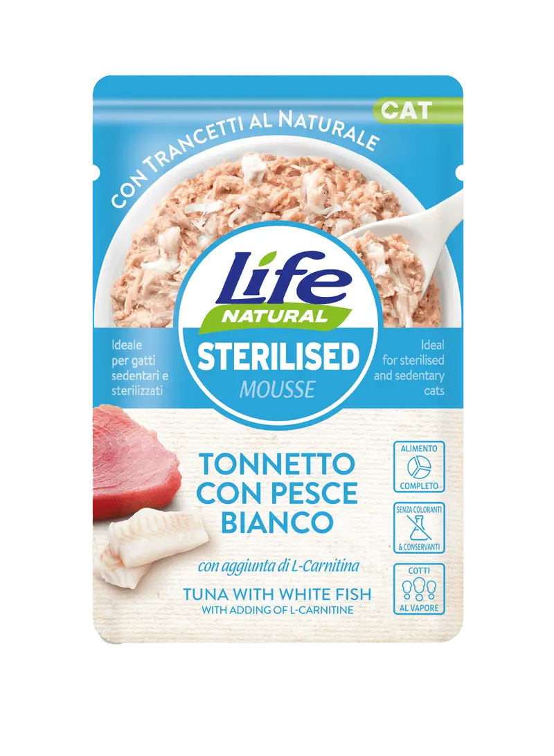 Повнораціонний вологий корм для стерилізованих котів із тунцем і білою рибою LifeCat Sterilised Mousse приготований у вигляді легкого мусу, що має ніжну консистенцію та відмінно смакує. Містить шматочки тунця та білої риби, підходить улюбленцям, які мало рухаються та схильні до набору зайвої ваги.