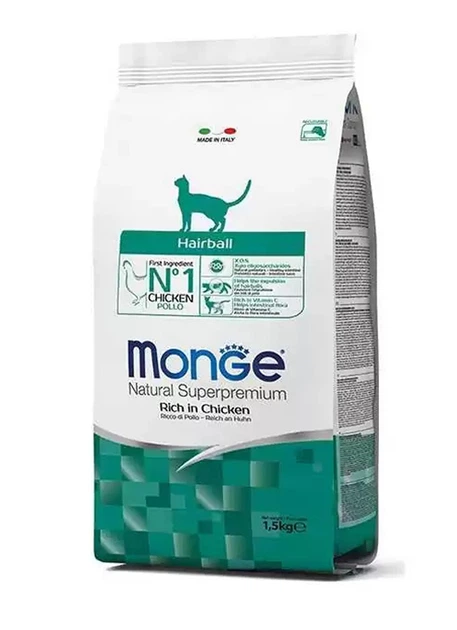 MONGE SUPERPREMIUM CAT HAIRBALL –це повноцінний збалансований раціон для дорослих домашніх котів, які часто страждають від скупчення грудок шерсті в шлунку.