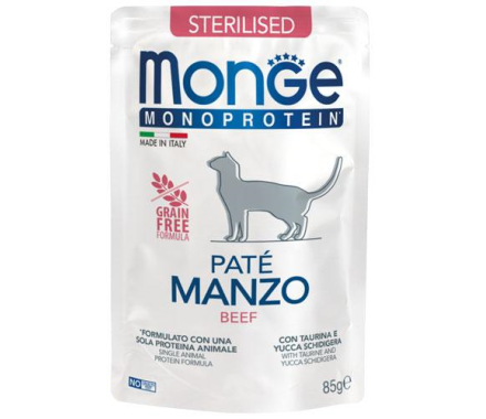 Monge Monoprotein Manzo -паучи для стерилизованных кошек с говядиной - это полноценный сбалансированный рацион из мяса говядины для стерилизованных кошек с особыми потребностями.