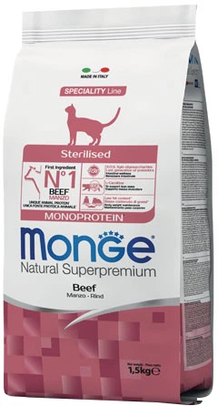 Monge Cat Monoprotein Sterilised Beef корм для стерилізованих котів з яловичиною — це повноцінний збалансований раціон для стерилізованих котів зі зниженим вмістом калорій, що забезпечує профілактику ожиріння.