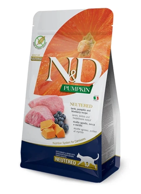 Farmina N&D Grain Free Pumpkin, Lamb Blueberry Neutered – повнораціонний беззерновий корм для дорослих стерилізованих кішок і кастрованих котів з гарбузом, ягням та чорницями.