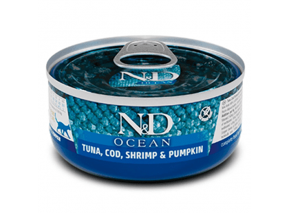 Вологий корм Farmina N&D Grain Free Ocean Tuna, Cod, Shrimp & Pumpkin створений спеціально для пухнастих вибагливих гурманів. Соковитий стейк тунця, ніжне філе тріски та апетитні креветки – це не лише райська насолода для котячих рецепторів, але й потужне джерело високоякісного білка та незамінних Омега-3 жирних кислот, що піклуються про сяючу шерсть і здорову шкіру. Додавання солодкого та корисного гарбуза збагачує раціон клітковиною, підтримуючи здорове травлення.