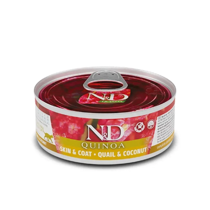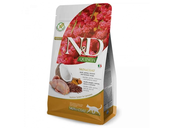 Пищевая непереносимость может создавать много трудностей в уходе за животными, ведь реакция организма на аллерген может быть достаточно резкой и повлечь за собой существенные проблемы со здоровьем питомца. Качественный корм, с высоким содержанием гипоаллергенного белка, поможет справиться с проблемой и обеспечить коту здоровое, полезное питание. Farmina (Фармина) N&D Quinoa GF Skin&Coat Adult Cat – беззерновой корм, где главным источником протеина является диетическое мясо птицы (перепел, индейка, курица) с добавлением белка жвачных животных (ягнёнок, говядина) а также свинины.