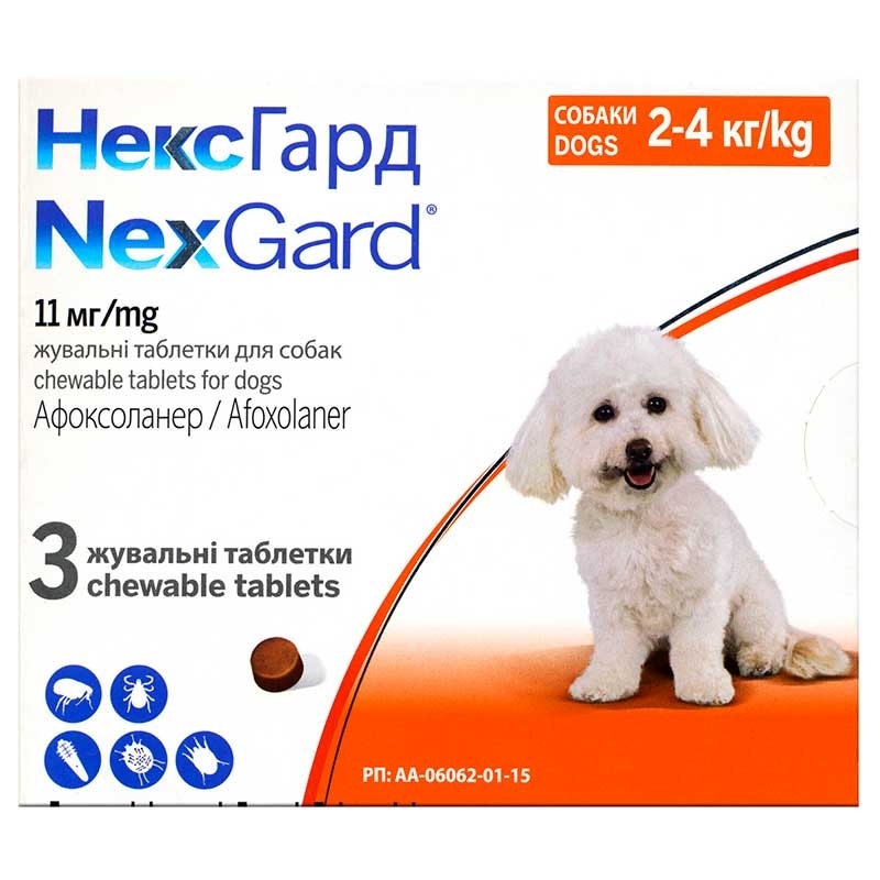 NexGard (Нексгард) 2–4 кг — це сучасний протипаразитарний засіб у формі смачних жувальних таблеток, розроблений для надійного захисту собак малих та мініатюрних порід від бліх та кліщів. Засіб базується на активній речовині афоксоланер, яка швидко всмоктується та починає діяти вже за кілька годин після прийому, забезпечуючи загибель паразитів ще до моменту відкладання яєць. Завдяки невеликому розміру та приємному смаку яловичини, маленькі собаки охоче поїдають таблетку як ласощі, що робить процес захисту легким та комфортним для власника. Препарат зберігає свою ефективність протягом повного місяця, незалежно від купання чи прогулянок на свіжому повітрі. В упаковці міститься три таблетки, проте засіб доступний для придбання поштучно. NexGard гарантує щоденний добробут вашого крихітного вихованця, надійно захищаючи його від небезпечних захворювань.