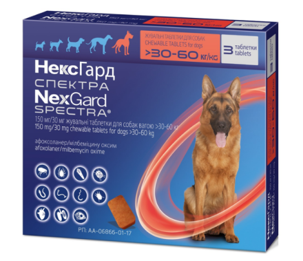 НексГард Спектра - комбінований протипаразитний препарат для собак вагою від 30 до 60 кг. Діючі речовини, які входять до складу препарату (афоксоланер, мілбеміцину оксим), забезпечують його широкий спектр протипаразитарної дії до ектопаразитів і нематод, які паразитують у собак.