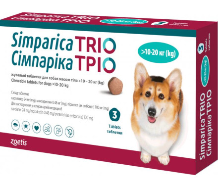Сімпаріка Тріо Жувальні таблетки для собак від бліх кліщів і глистів 10-20 кг Ціна за 1 табл