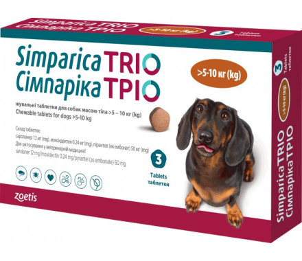 Сімпаріка Тріо Жувальні таблетки для собак від бліх кліщів і глистів 5-10 кг Ціна за 1 табл