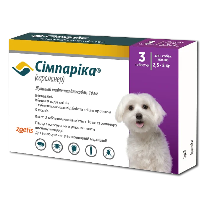 Simparica (Симпарика 10 мг) Таблетки від бліх та кліщів для собак вагою від 2,5 до 5 кг