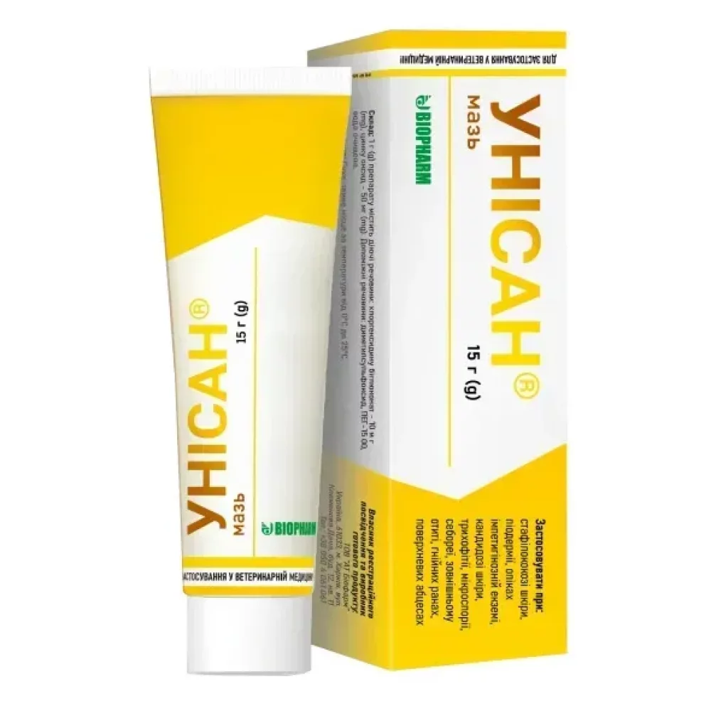 Мазь Унісан спеціально розроблена для лікування та догляду за шкірою котів та собак. Вона ефективно справляється з різними шкірними захворюваннями, такими як запалення, роздратування, свербіж та інші проблеми, які можуть турбувати ваших улюбленців.