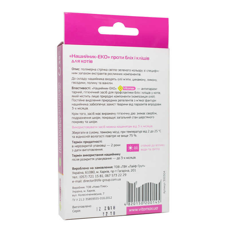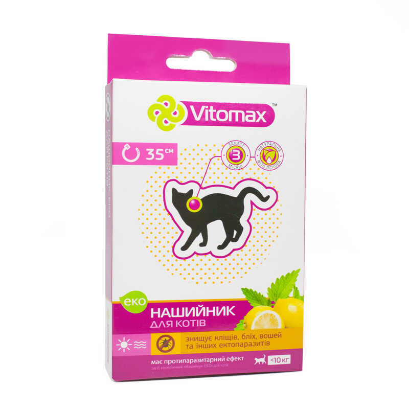 Нашийники від української компанії Vitomax допомагає розв’язати проблему паразитів. Модель довжиною 35 см підходить для дорослих котів та кішок будь-яких порід. Сам нашийник виконаний з поліуретану, тому ваша тварина не відчуватиме дискомфорту, а основні речовини, що діють, будуть безпечні для здоров’я. До складу входять натуральні олії, які дієво усувають присутніх паразитів і відлякують нових. А ключова особливість, що нашийники вітчизняного виробника мають специфічний запах для комах, при цьому не дратуючи нюх кота. Пристрій був розроблений ветеринарами та фармацевтами, тому надійно захищатиме до 90 днів, і стане ефективним протипаразитарним засобом та якісним профілактичним.