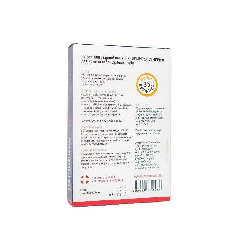 Протипаразитарний нашийник Vitomax Sempero для котів і собак малих порід, 35 см (помаранчевий колір)