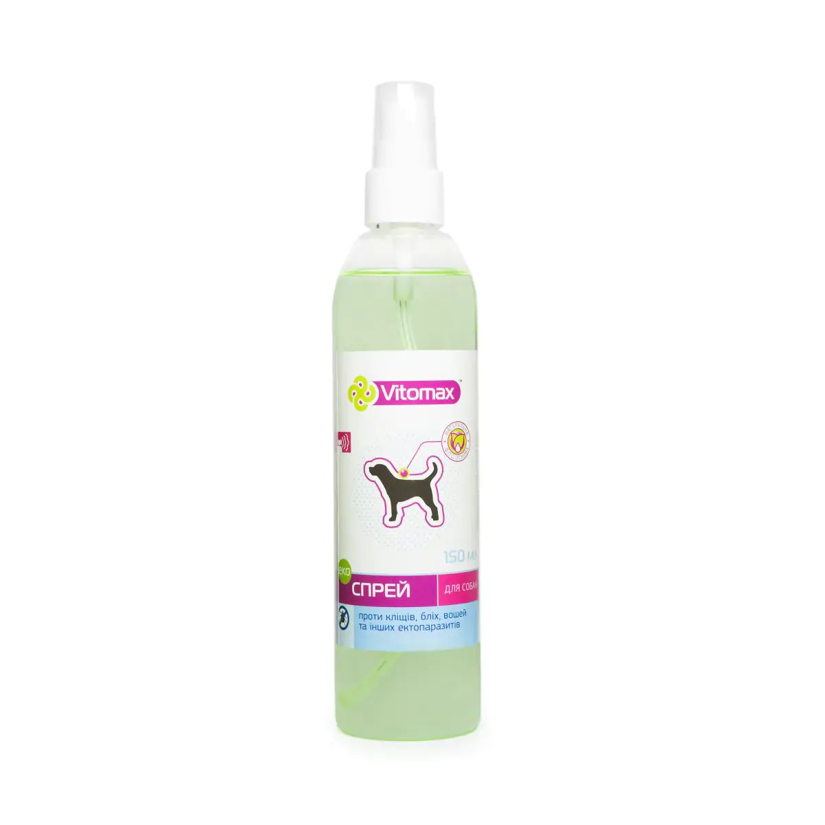 Еко спрей ТМ Vitomax являє собою рідину ніжно-зеленого кольору, з приємним ароматом. Призначений він для відлякування бліх, кліщів та вошей у собак. Також спрей має гігієнічну та заспокійливу дію - знімає подразнення, усуває свербіж.